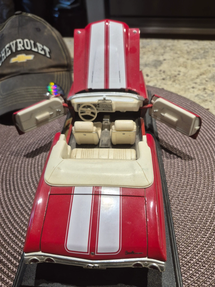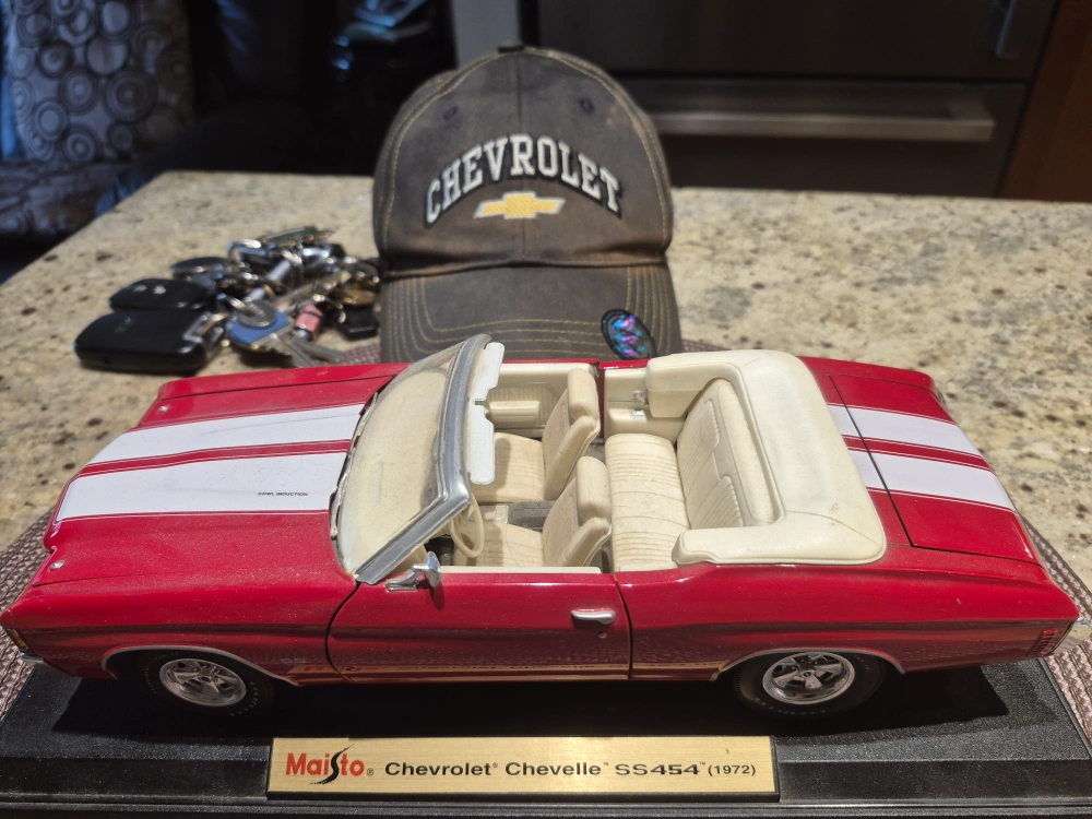 Selling a Maisto Special Edition diecast model of a 1972 Chevrolet Chevelle SS454. It's in good condition and features a red exterior with white stripes and a beige interior. The hood and doors open to reveal engine and interior details. Great for collectors! $60 cash on pickup in Kelowna.