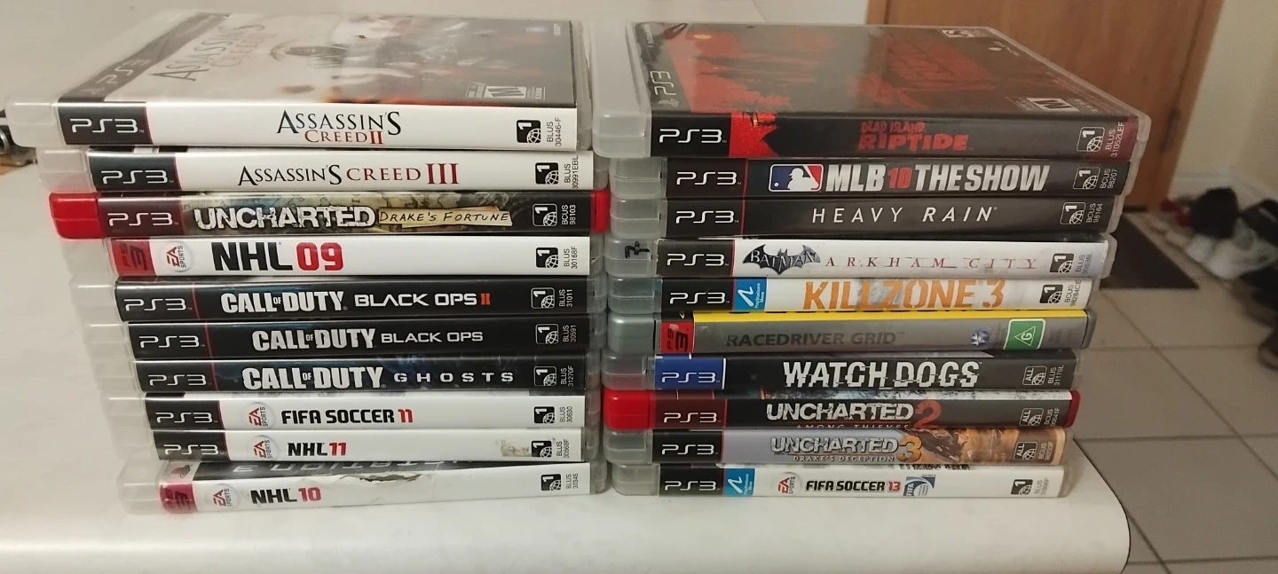 Bundle of assorted PlayStation 3 video games. Titles include Assassin's Creed series, Uncharted series, Call of Duty series, MLB The Show, NHL series, and more. All discs and cases appear to be in good condition. Perfect for any PS3 gamer!