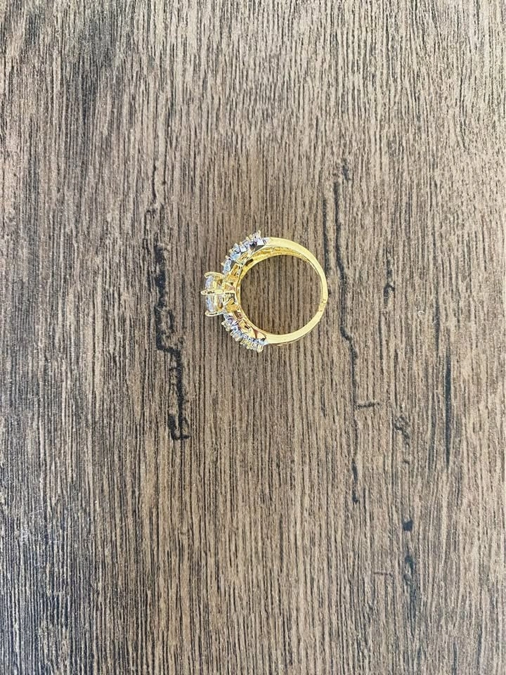 Sparkling gold color ring. Has a big clear stone in the middle and smaller clear stones on the band. Is adjustable, so fits different finger sizes.