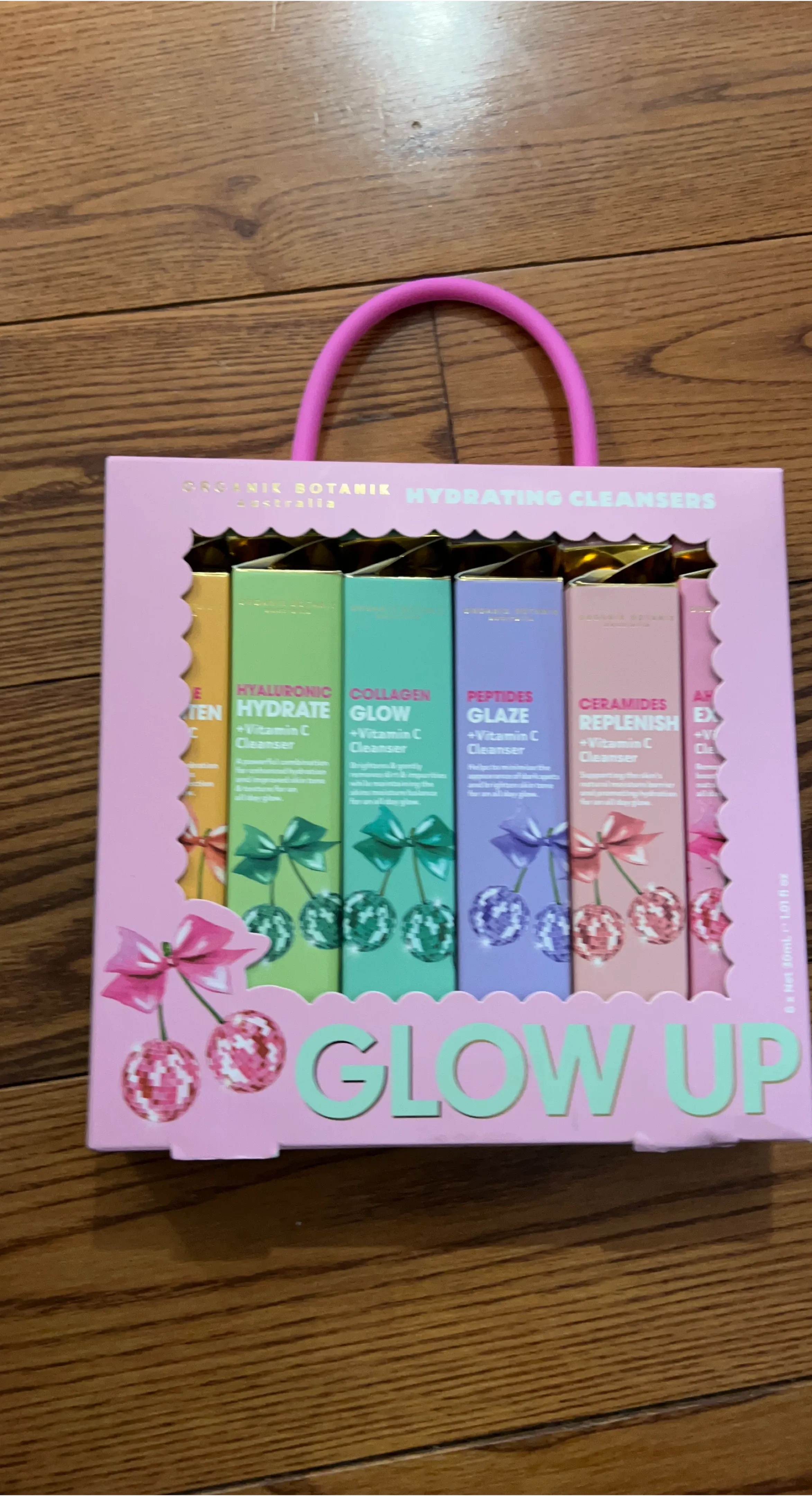 This set features Organik Botanik Hydrating Cleansers, including Hyaluronic Hydrate, Collagen Glow, Peptides Glaze, and Ceramides Replenish. Each cleanser is 30ml and contains Vitamin C. They're designed to hydrate and brighten the skin for a glowing complexion.