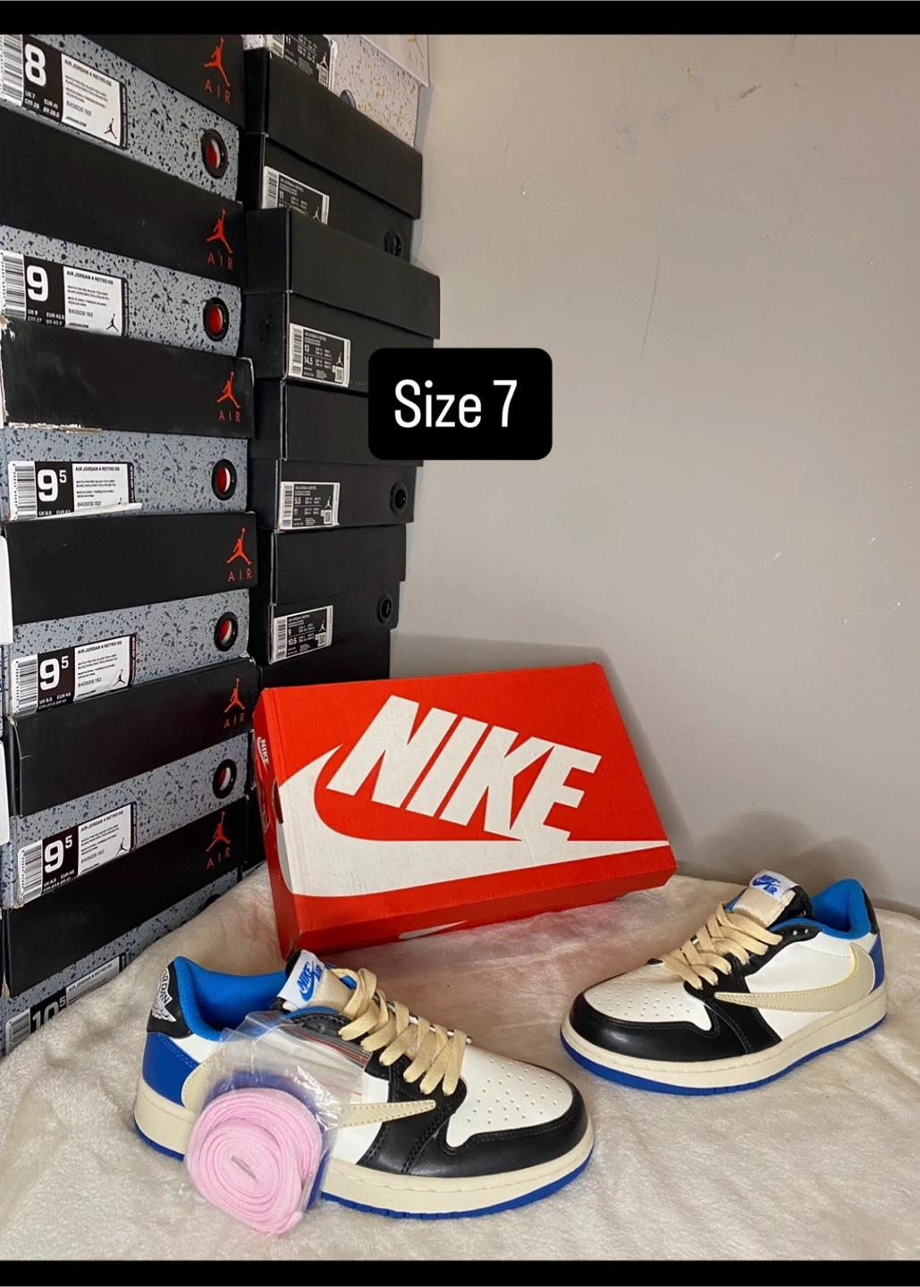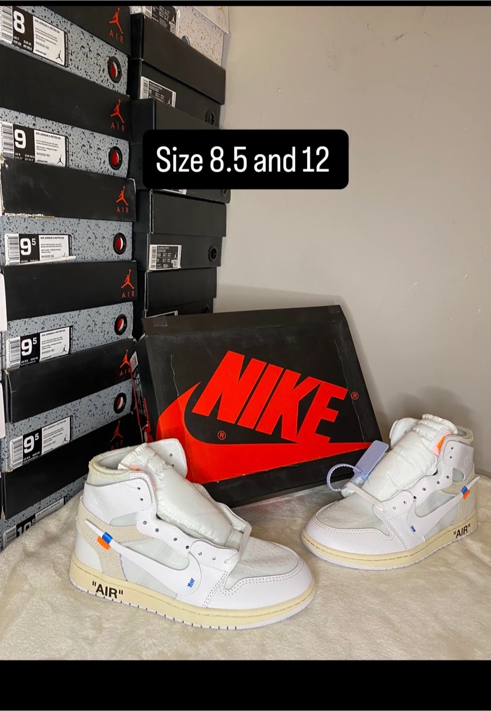 These are the Nike Air Jordan 1 High OFF-WHITE sneakers. They're available in multiple sizes. Includes original box and laces.