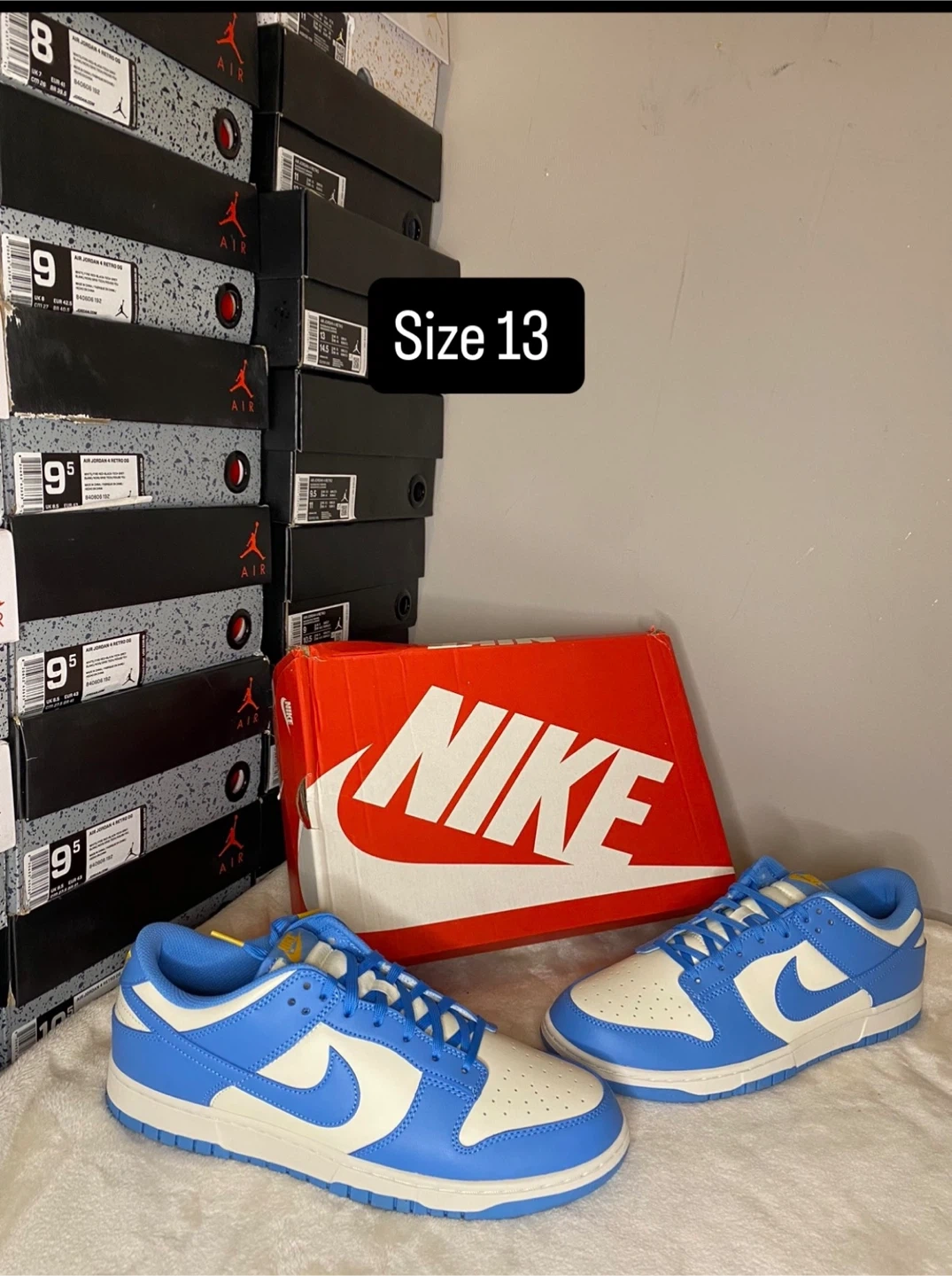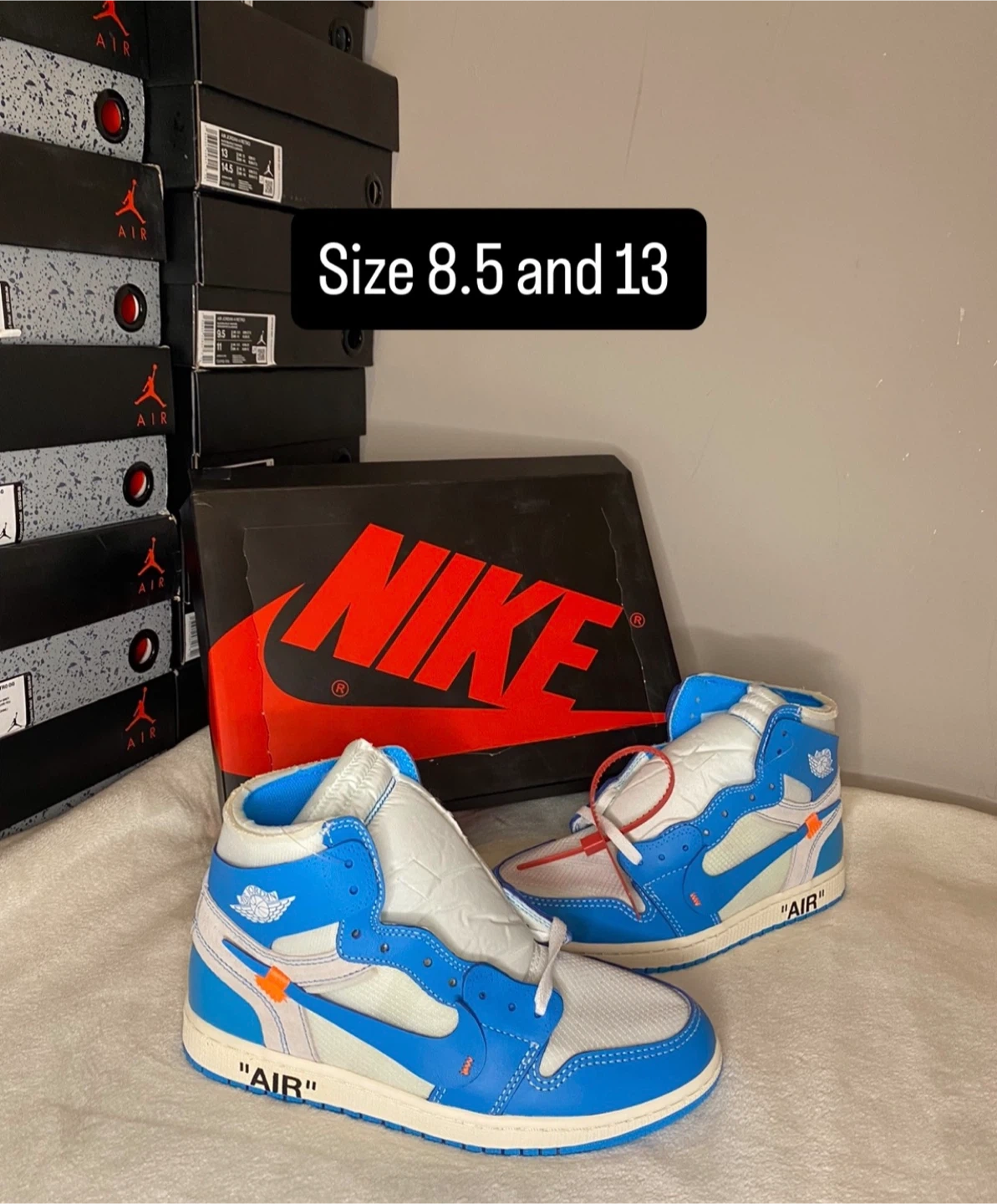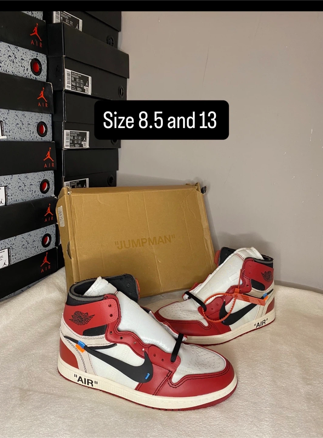 These are the Nike Air Jordan 1 High OFF-WHITE sneakers. They're available in multiple sizes. Includes original box and laces.