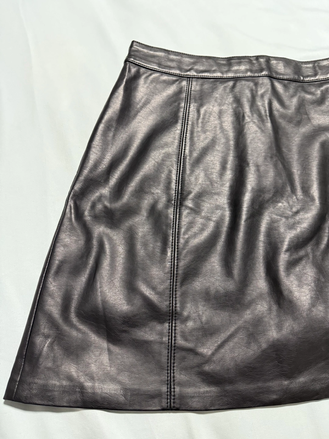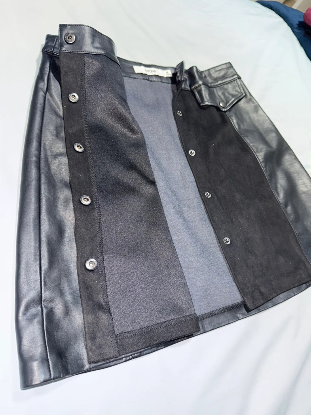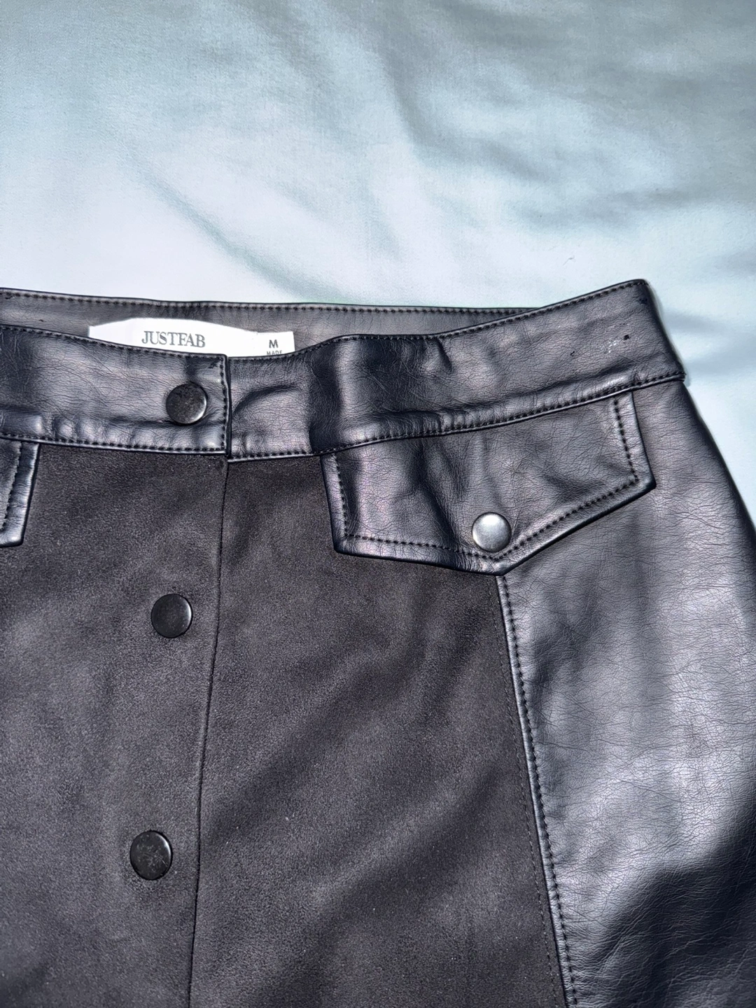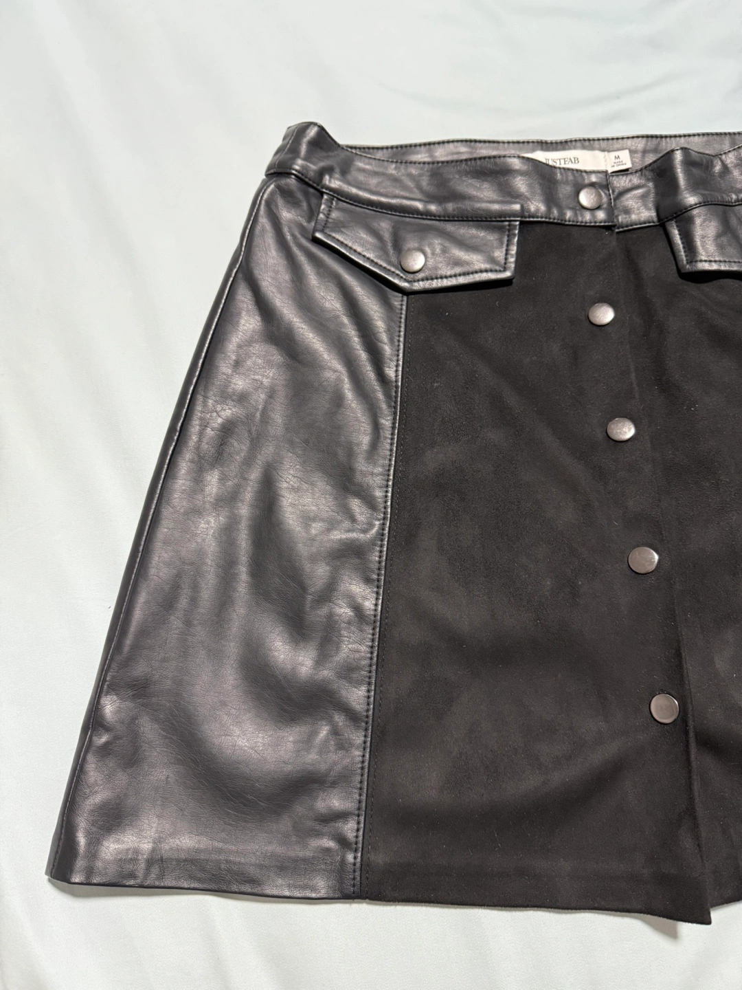 Comfortable lightweight skirt featuring a snap-button front, faux leather paneling, and faux suede center. Western-inspired flap pocket details at the waist. Worn maybe once or twice. Size M