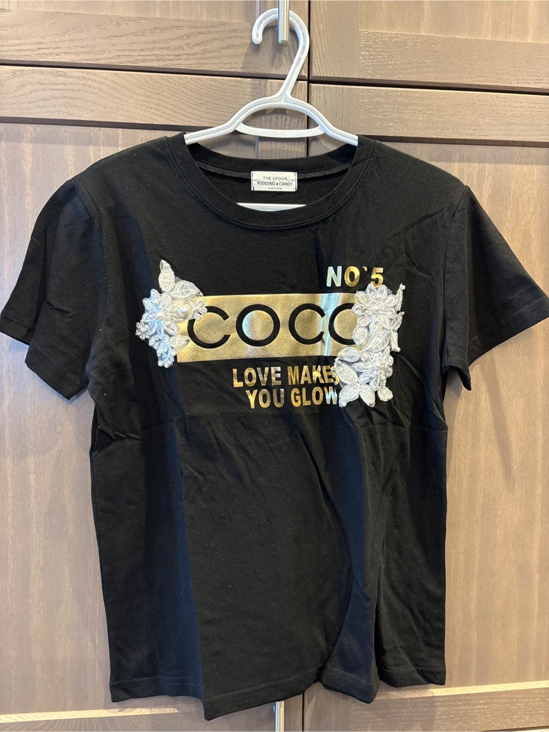 Here's a cute black t-shirt from The Spoon Pudding Candy! It features a Coco design with floral embellishments. Made in Korea.