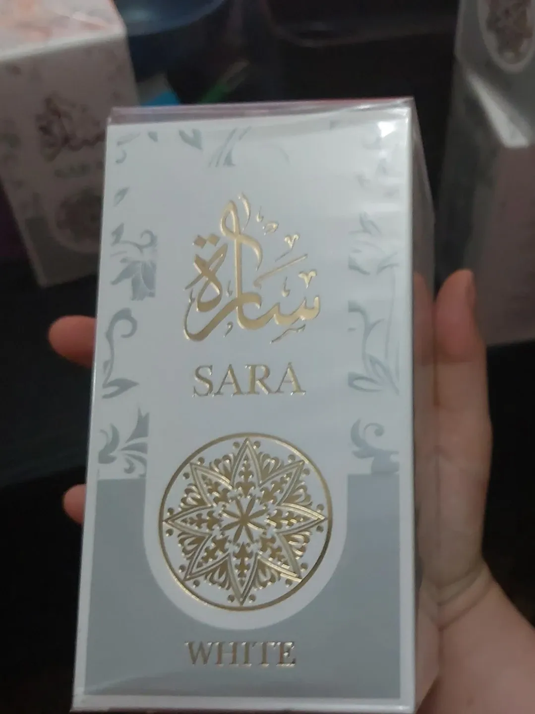 This is a bottle of SARA White perfume. The packaging is white and gray with gold accents. It's a scent for everyday wear.