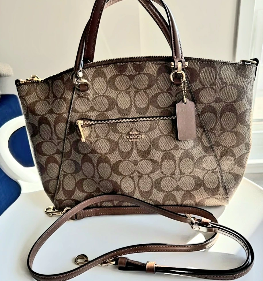 A classic Coach satchel handbag featuring the signature monogram pattern. It's made with durable coated canvas and leather trim. This bag comes with both top handles and a detachable shoulder strap for versatile carrying. It has an interior zip pocket and a secure top zip closure.