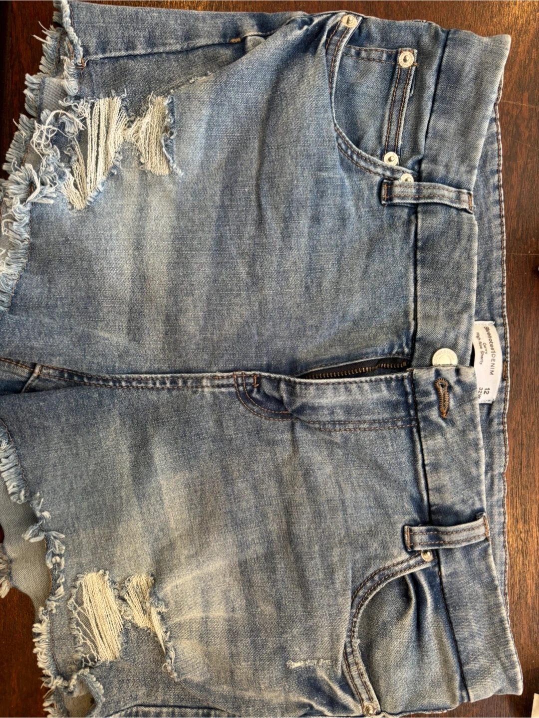 Sheer Genius denim shorts with a distressed look. Features a frayed hem and rips for a stylish vibe. Size 12.