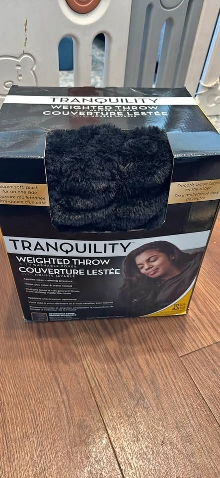 Brand new TRANQUILITY weighted throw blanket in black. 10 pounds. Features a washable cover with super soft plush fur on one side and smooth plush fabric on the other. Great for relaxing and applying calming pressure. Never used. Moving sale. Pick up in Acadia SE.