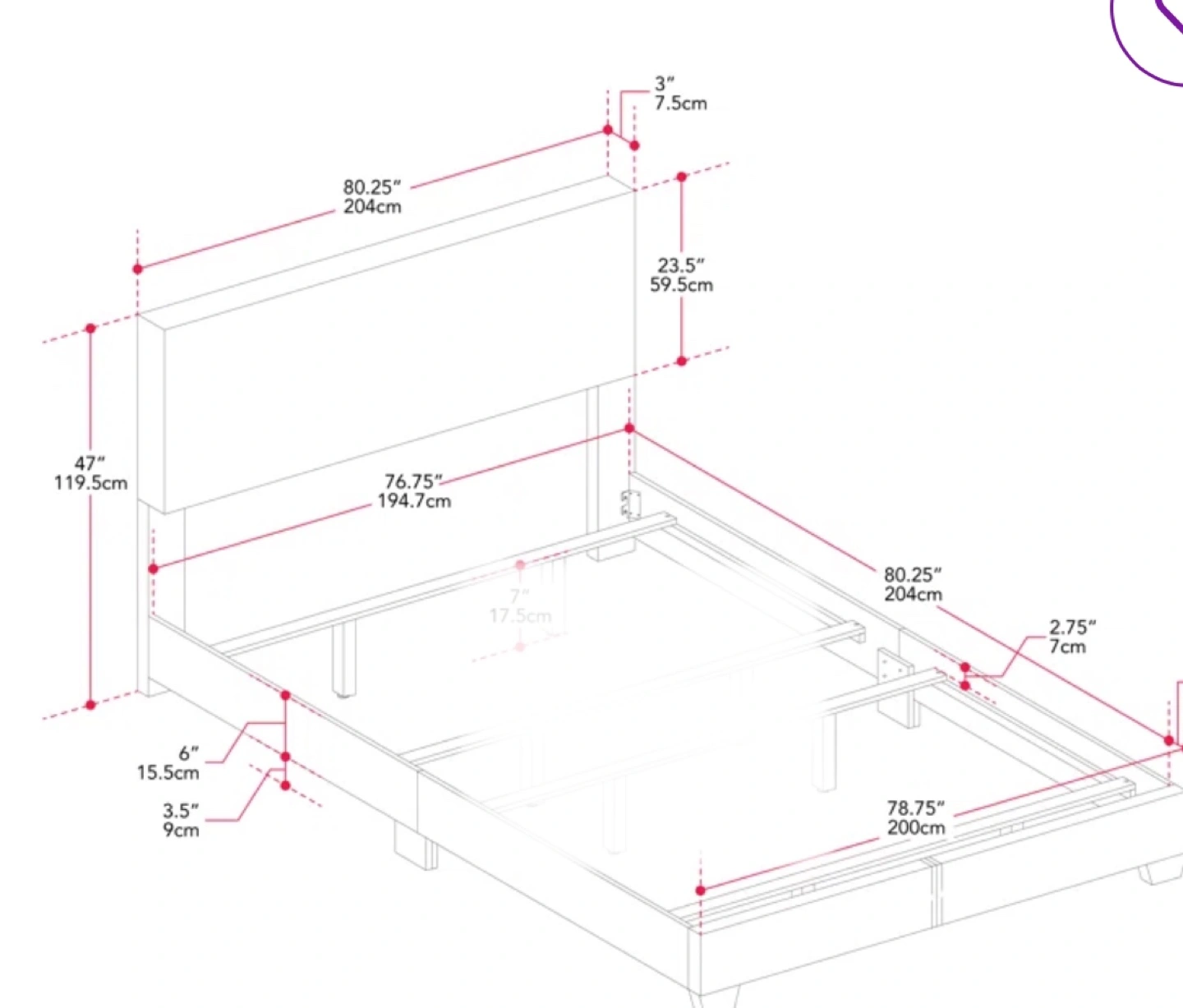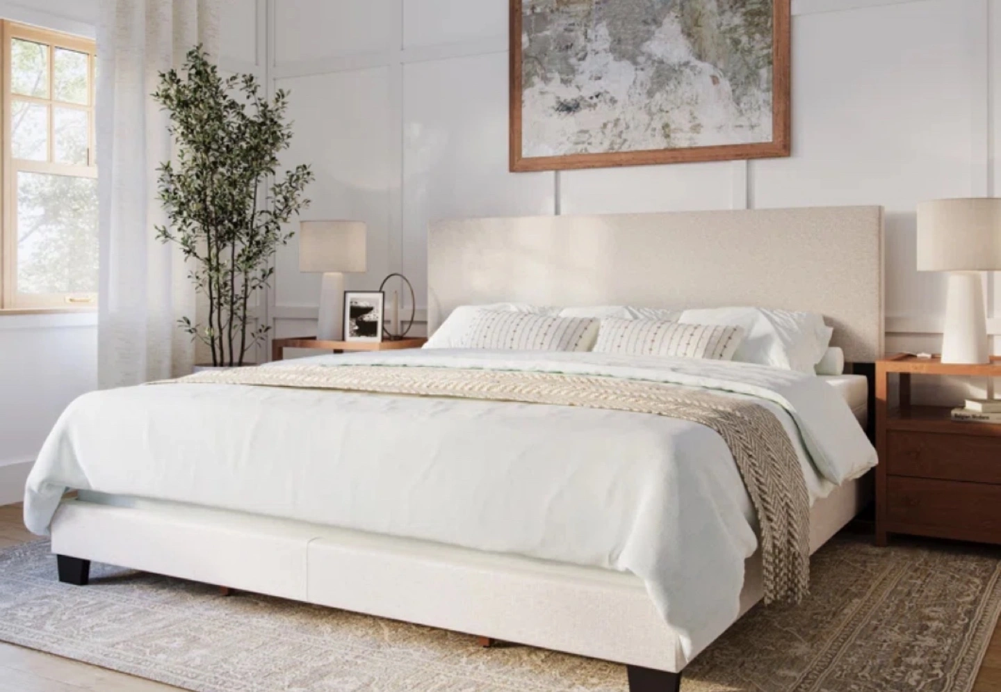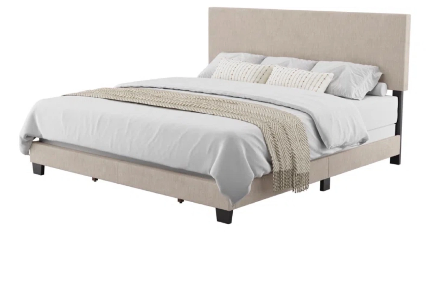 IN BOX 📦King-size platform bed frame. Beige upholstered headboard and footboard. Sleek and modern design. Sturdy construction. Simple assembly required. Excellent condition.