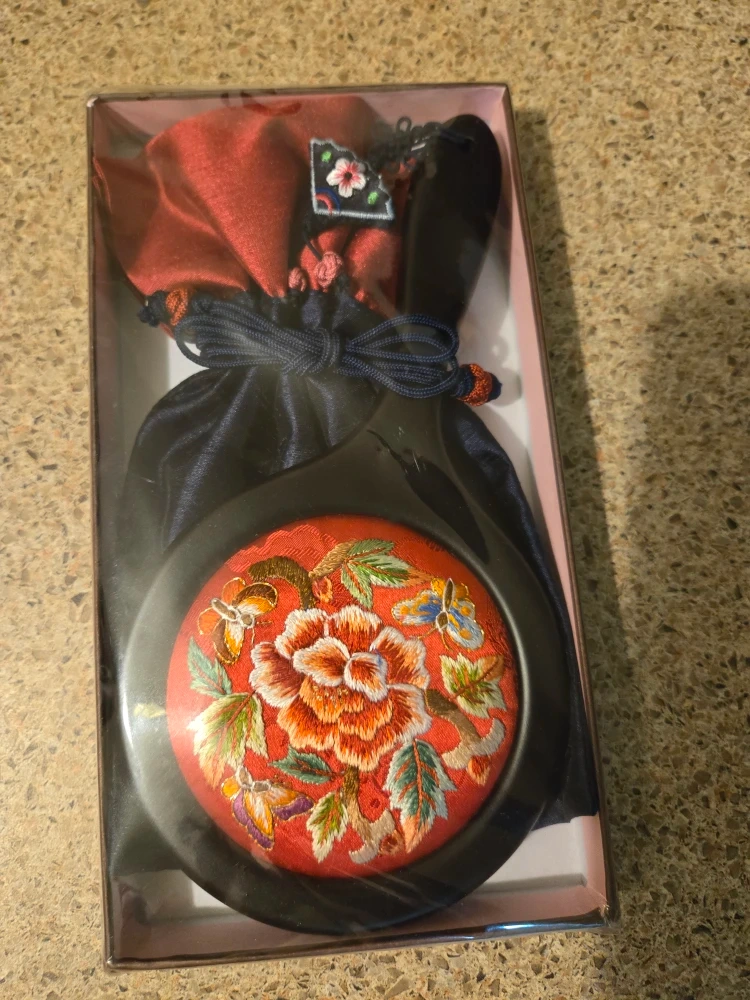 Selling a beautiful Korean hand mirror! It comes with a lovely embroidered design and includes a pouch and the original box. It's in great condition , unopened.
