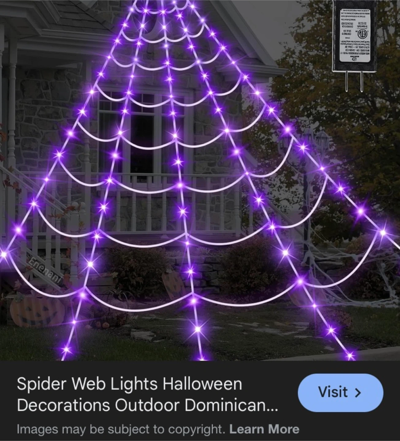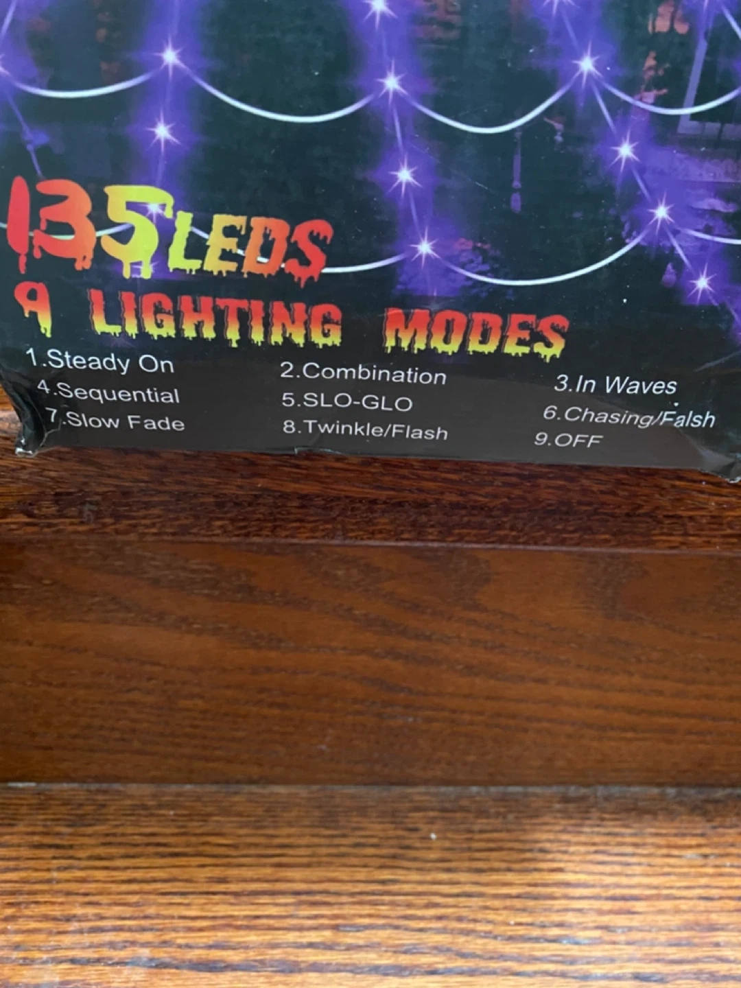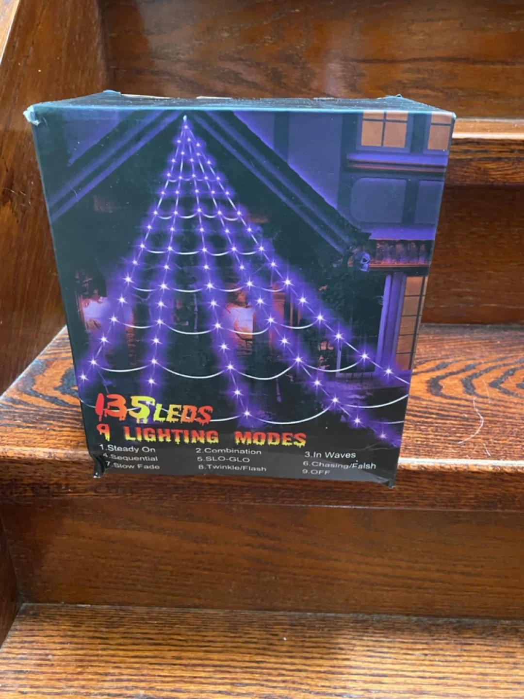 Decorate your home with these purple LED spider web lights! They feature 135 LEDs and 9 different lighting modes for a spooky or festive atmosphere. Easy to untangle and install for your Halloween display.