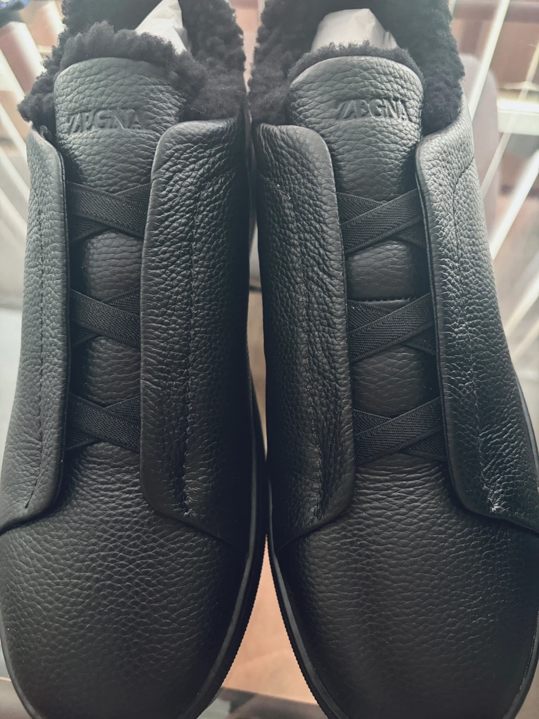 Selling a pair of Zegna slip-on sneakers in black leather. These are in great condition and come with the original dust bag. Perfect for a casual yet stylish look!