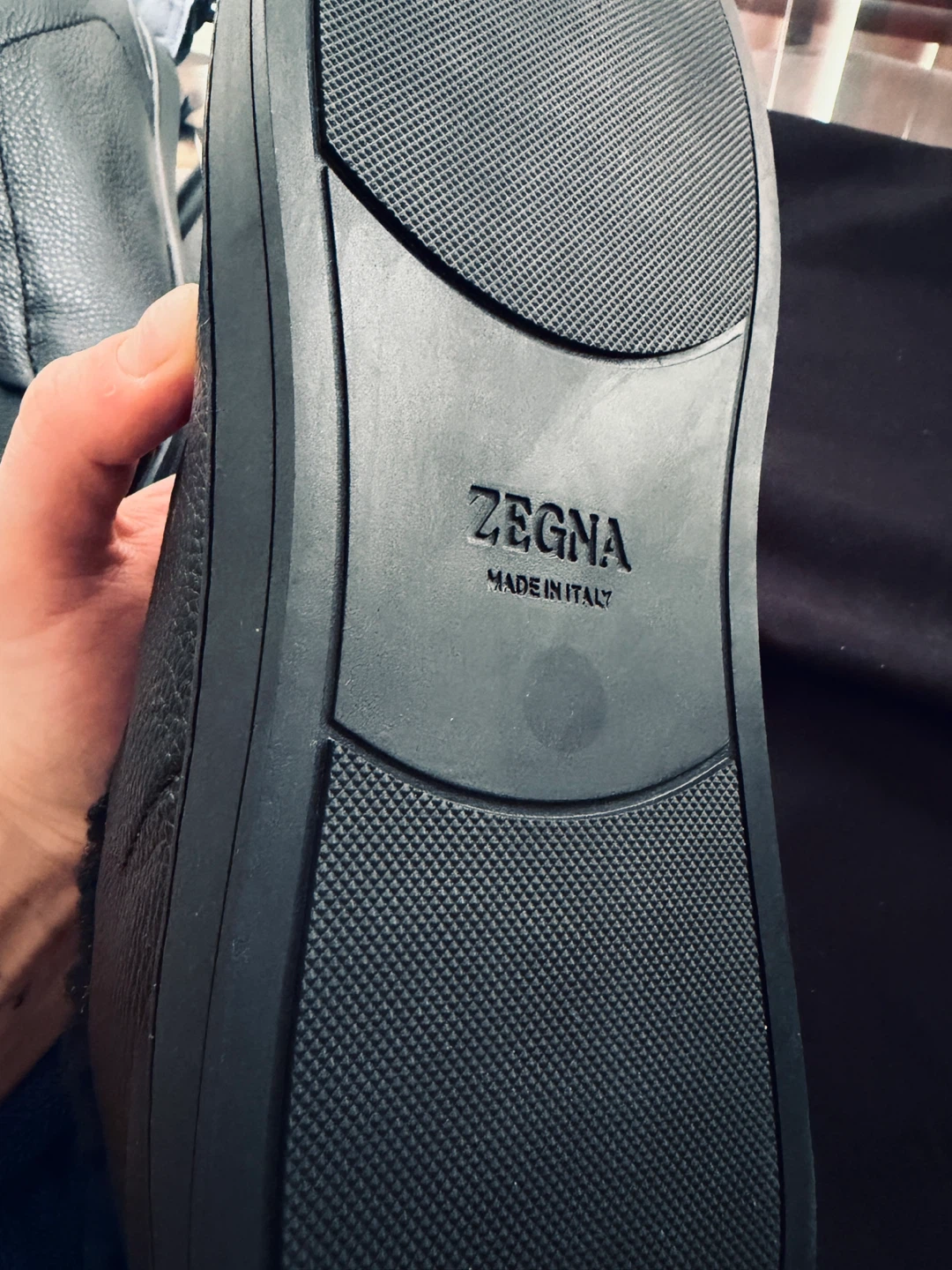 Selling a pair of Zegna slip-on sneakers in black leather. These are in great condition and come with the original dust bag. Perfect for a casual yet stylish look!