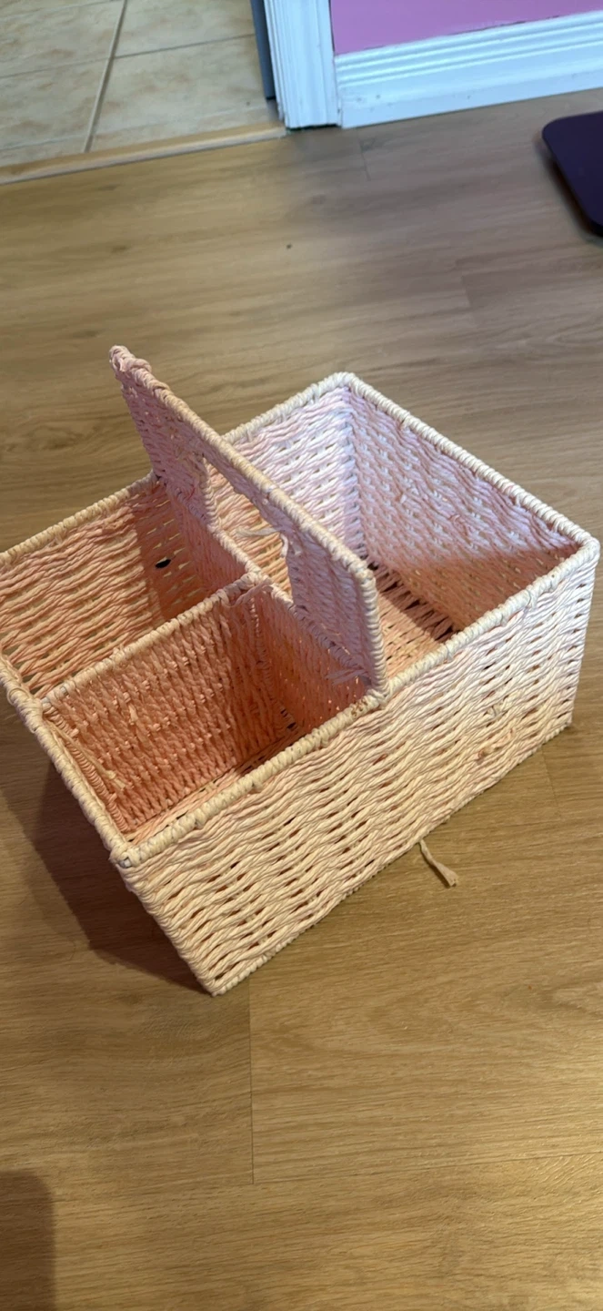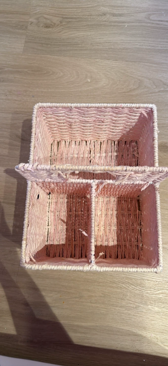 Pink woven organizer basket with three compartments. It's made of a woven material. This basket is great for storing small items on a desk or vanity.