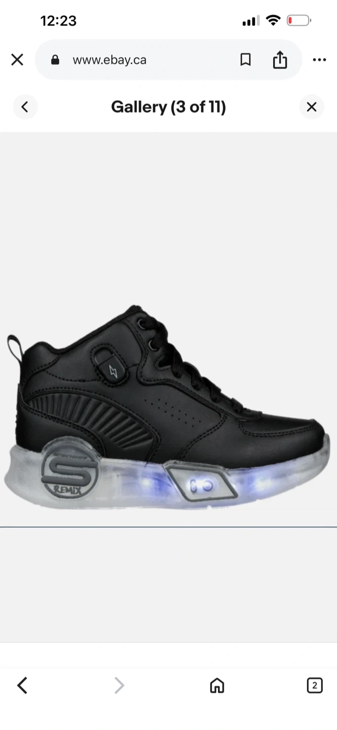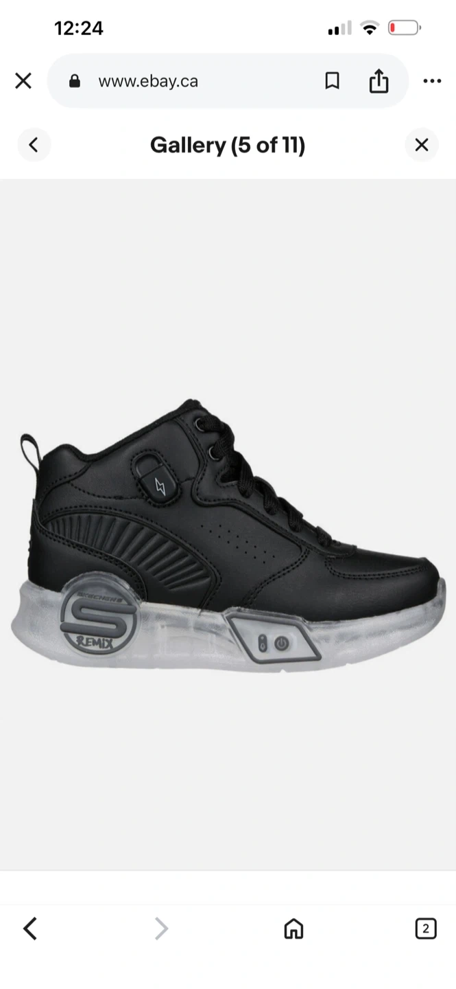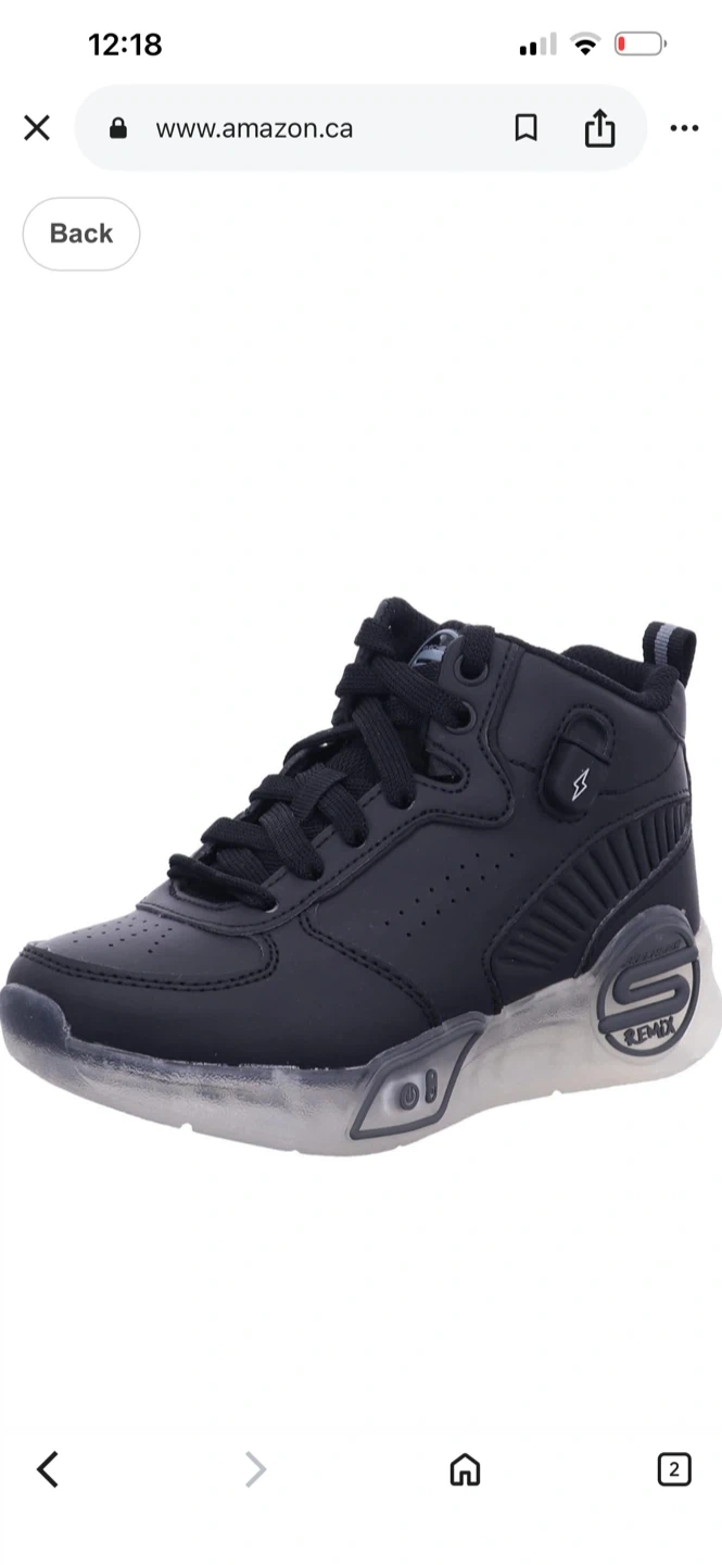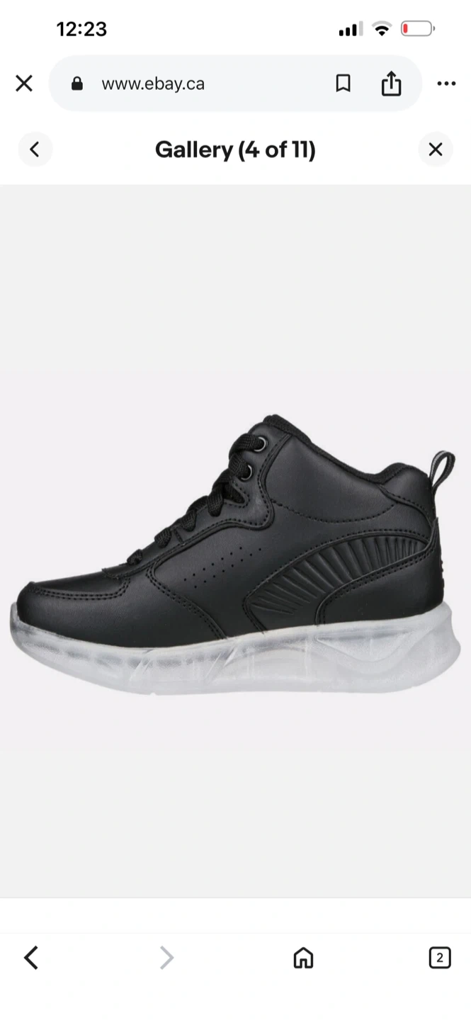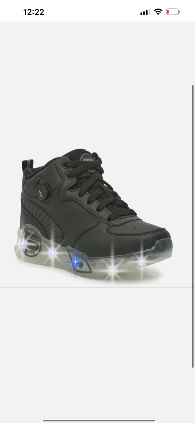 Black mid-top sneakers with light-up soles. These Skechers feature laces for a secure fit, come with a USB for sole lights recharging. They're built for comfort and fun!