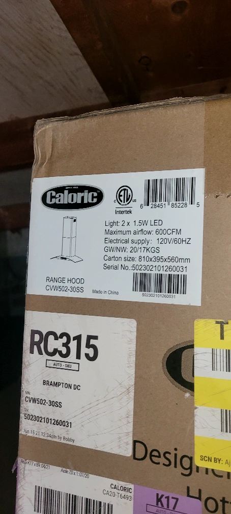 Selling a Caloric range hood, model CVW502-30SS. It features 2 x 1.5W LED lights and a maximum airflow of 600CFM. Electrical supply is 120V/60HZ. The carton size is 810x395x560mm. It's in its original box!