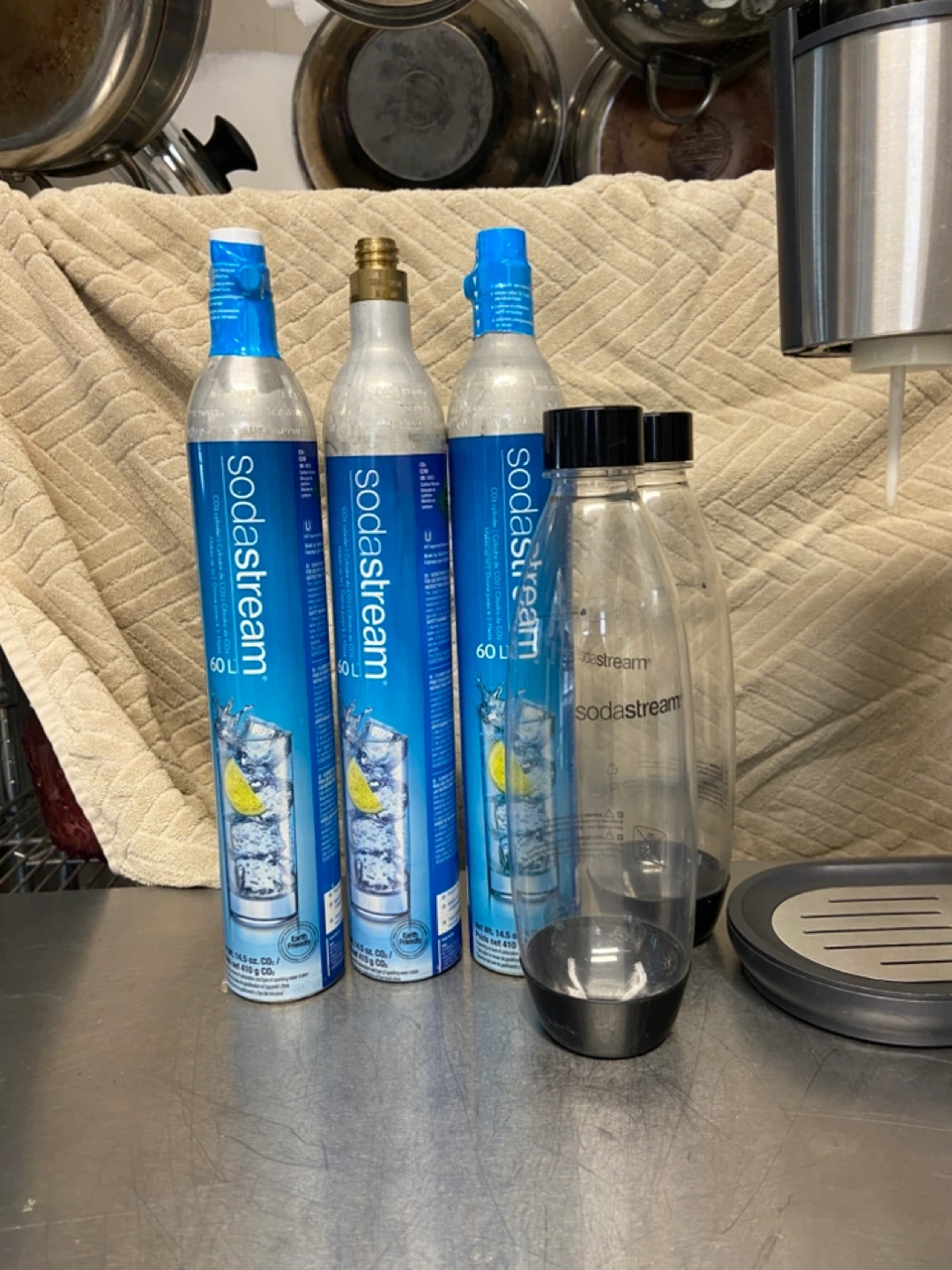 SodaStream sparkling water maker with three 60L CO2 cylinders (2 never used but old). Approx. value $15 per cylinder. Comes with two reusable carbonating bottles and one small metal bowl. The carbonating bottles are made of plastic and are dishwasher safe. This machine is great for making your own fizzy drinks at home!