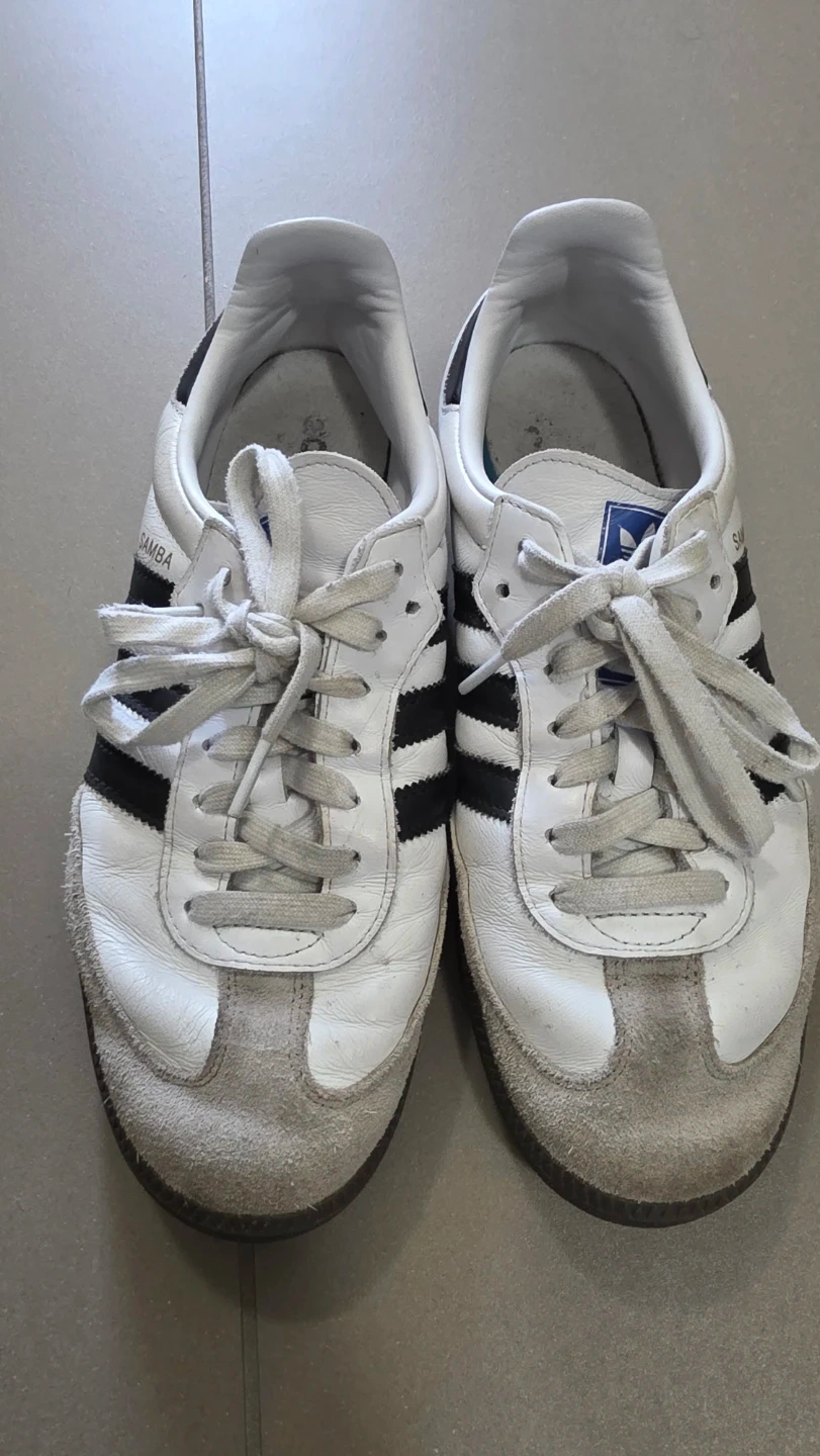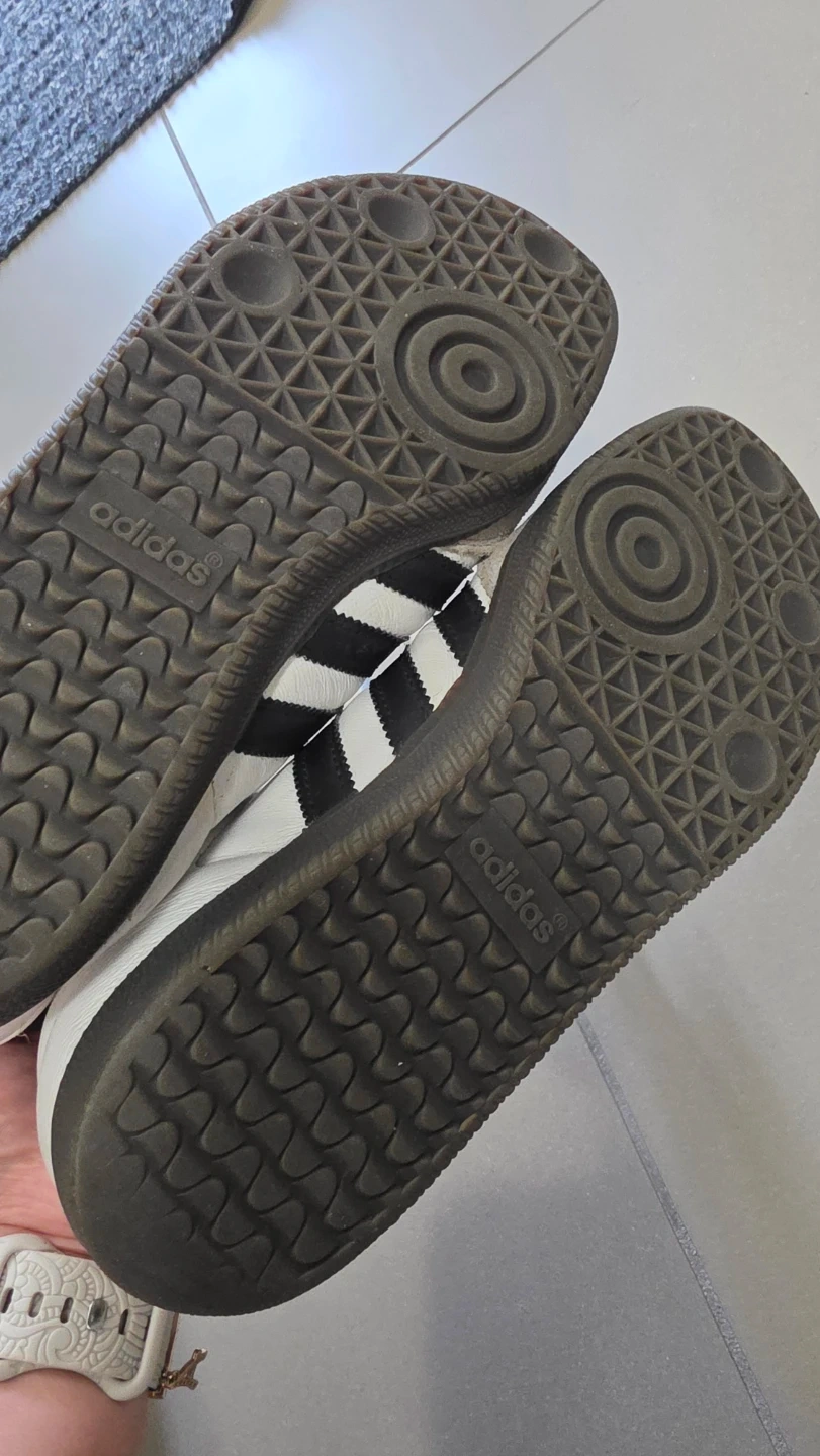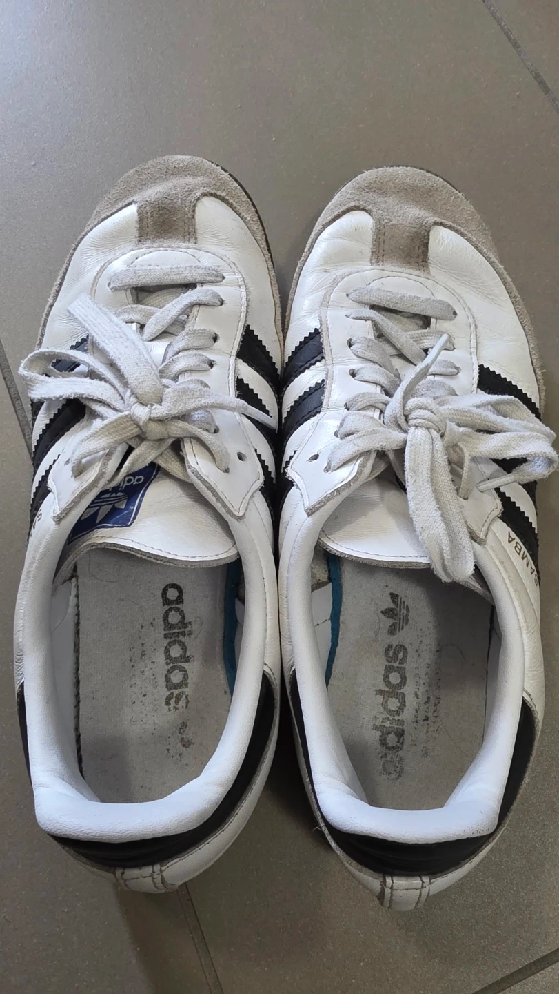Classic Adidas Samba sneakers in white with black stripes. Made with a mix of leather and suede. Size 8.5 US / 42 EU.