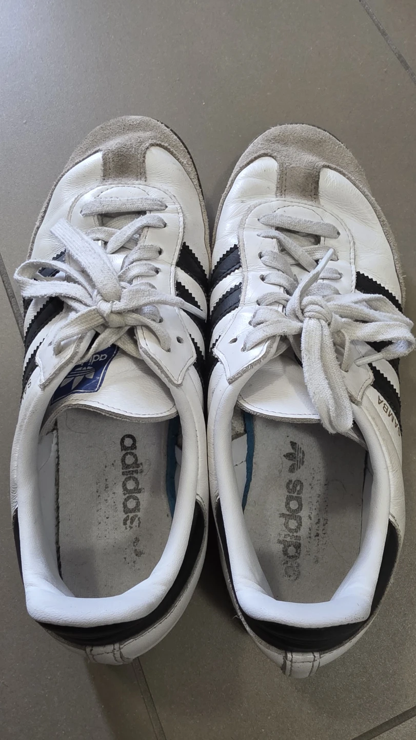 Classic Adidas Samba sneakers in white with black stripes. Made with a mix of leather and suede. Size 8.5 US / 42 EU.