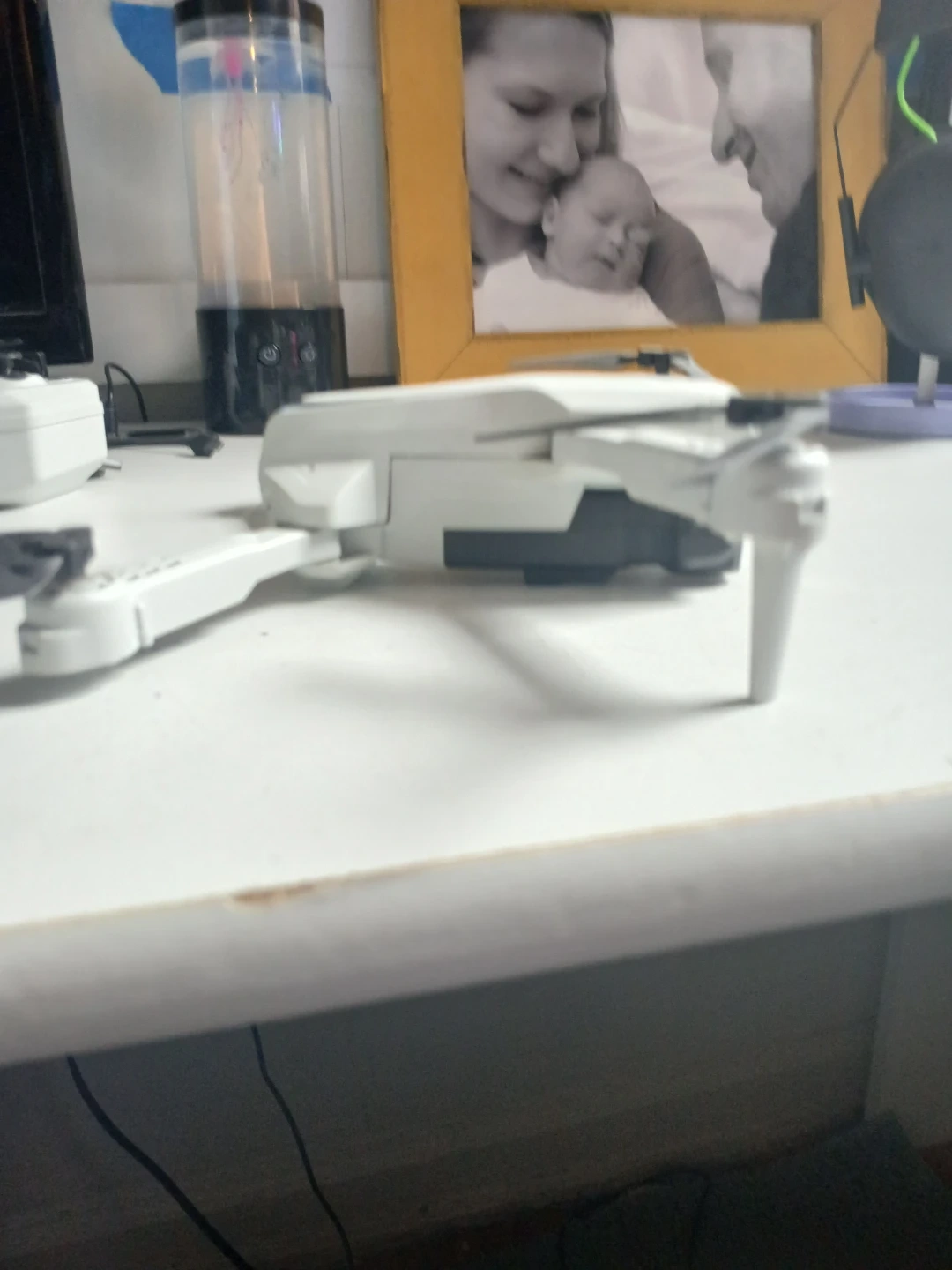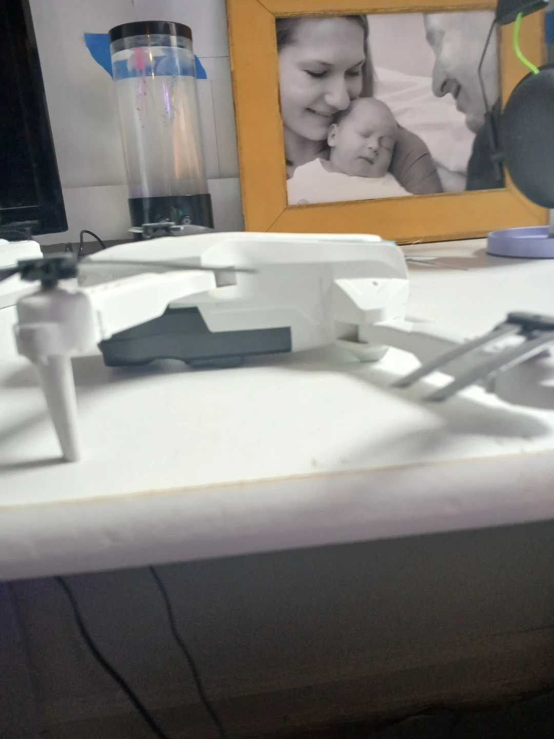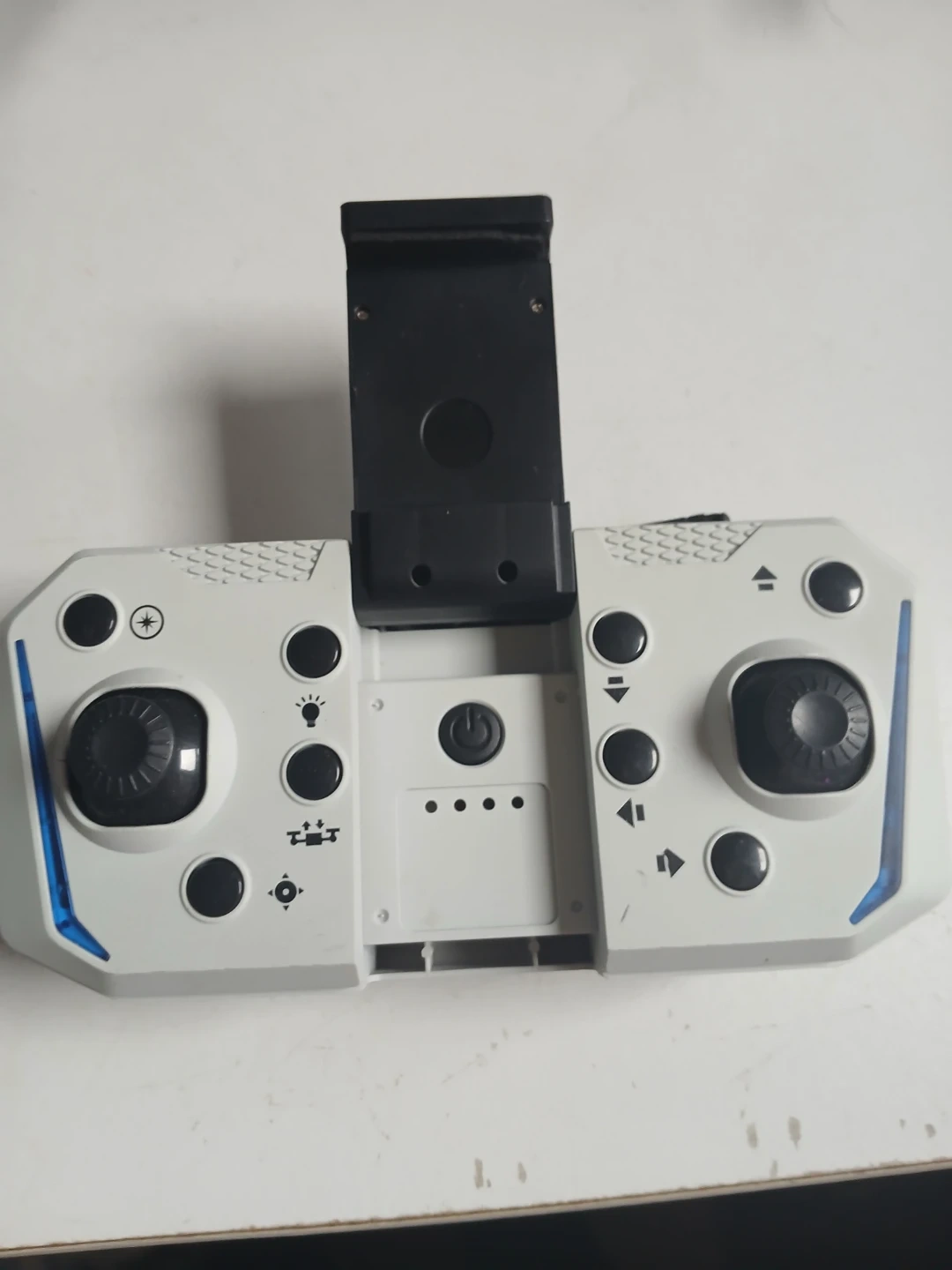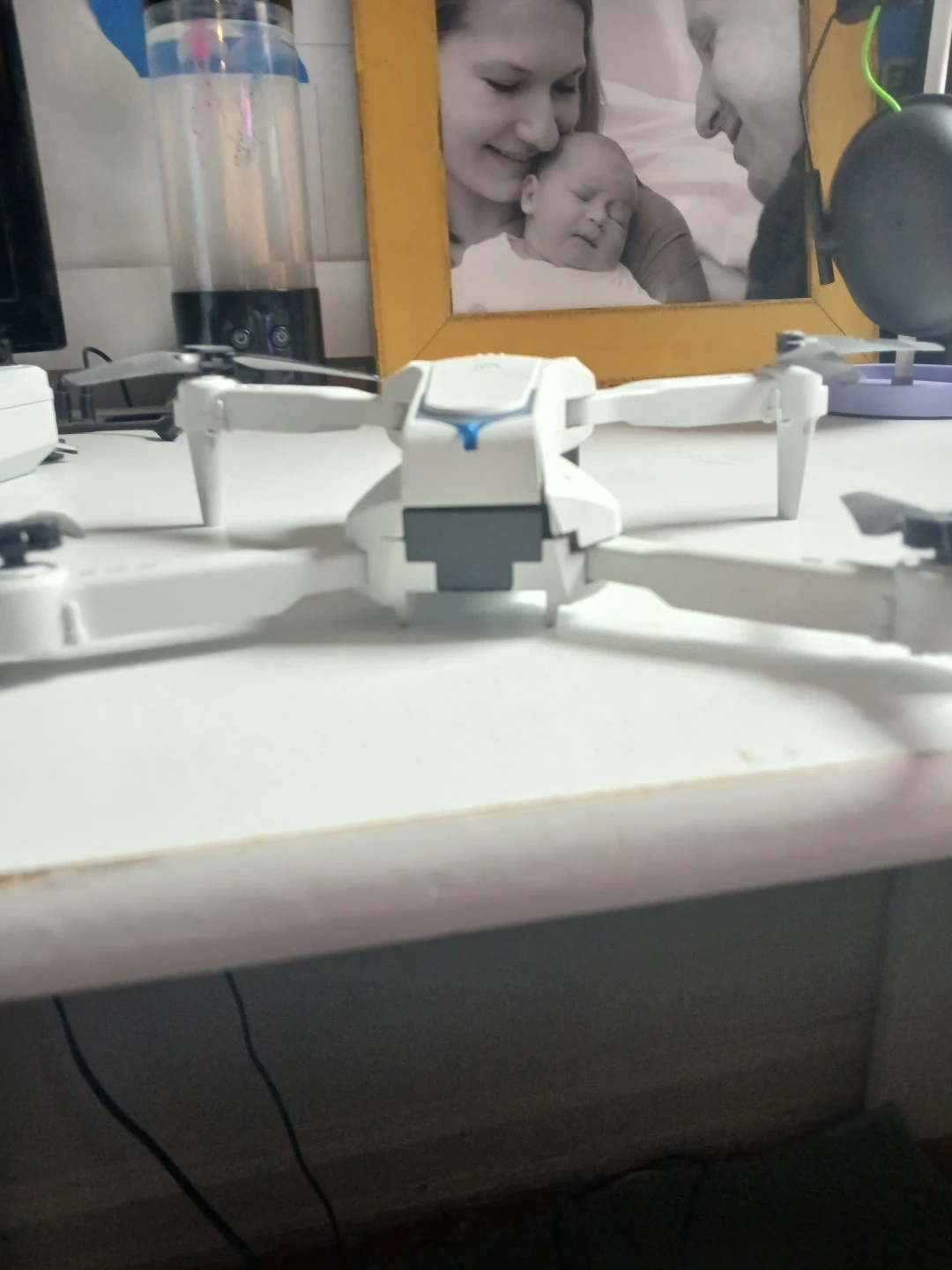This white foldable drone comes with a remote control and charging cable. It's compact and easy to transport in its included case. Perfect for beginners wanting to learn drone flying!