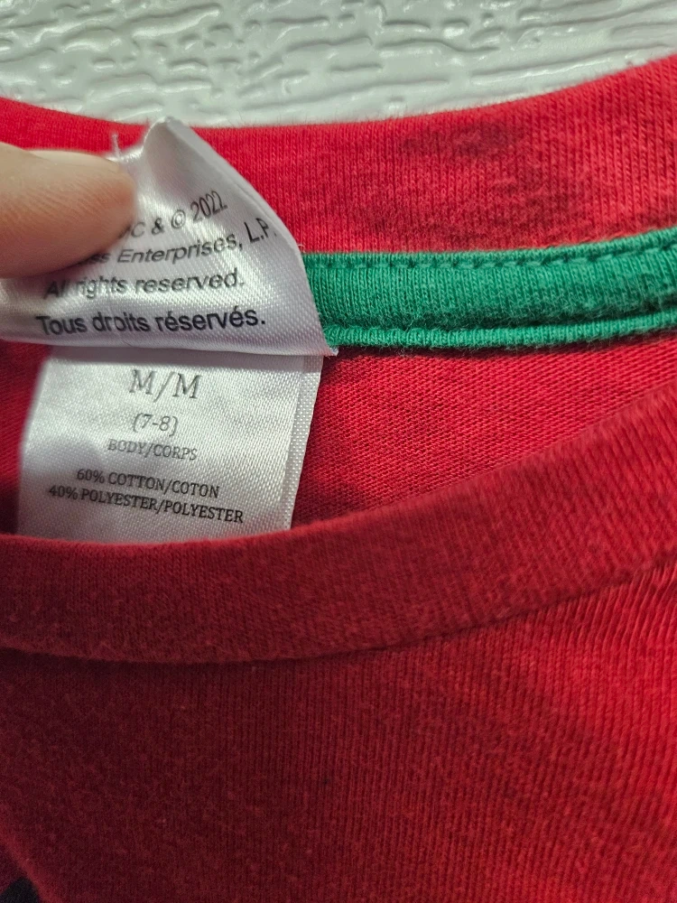 This is a cute Merry Grinchmas shirt in size M (7-8). The shirt is red and made of 60% cotton and 40% polyester
