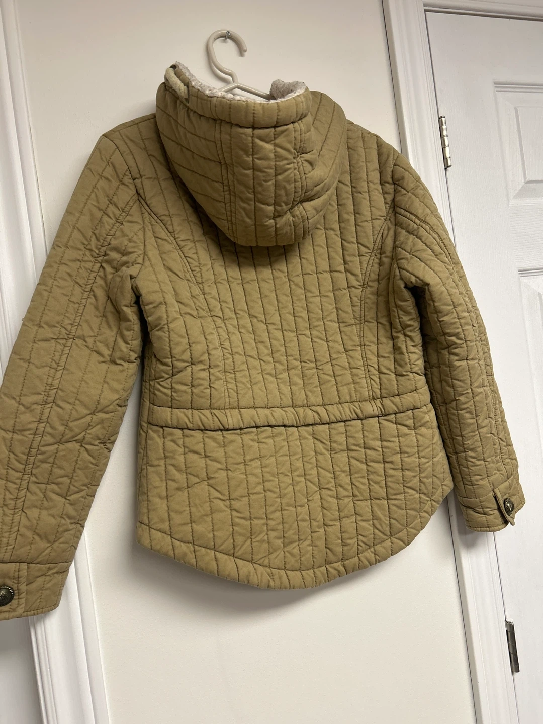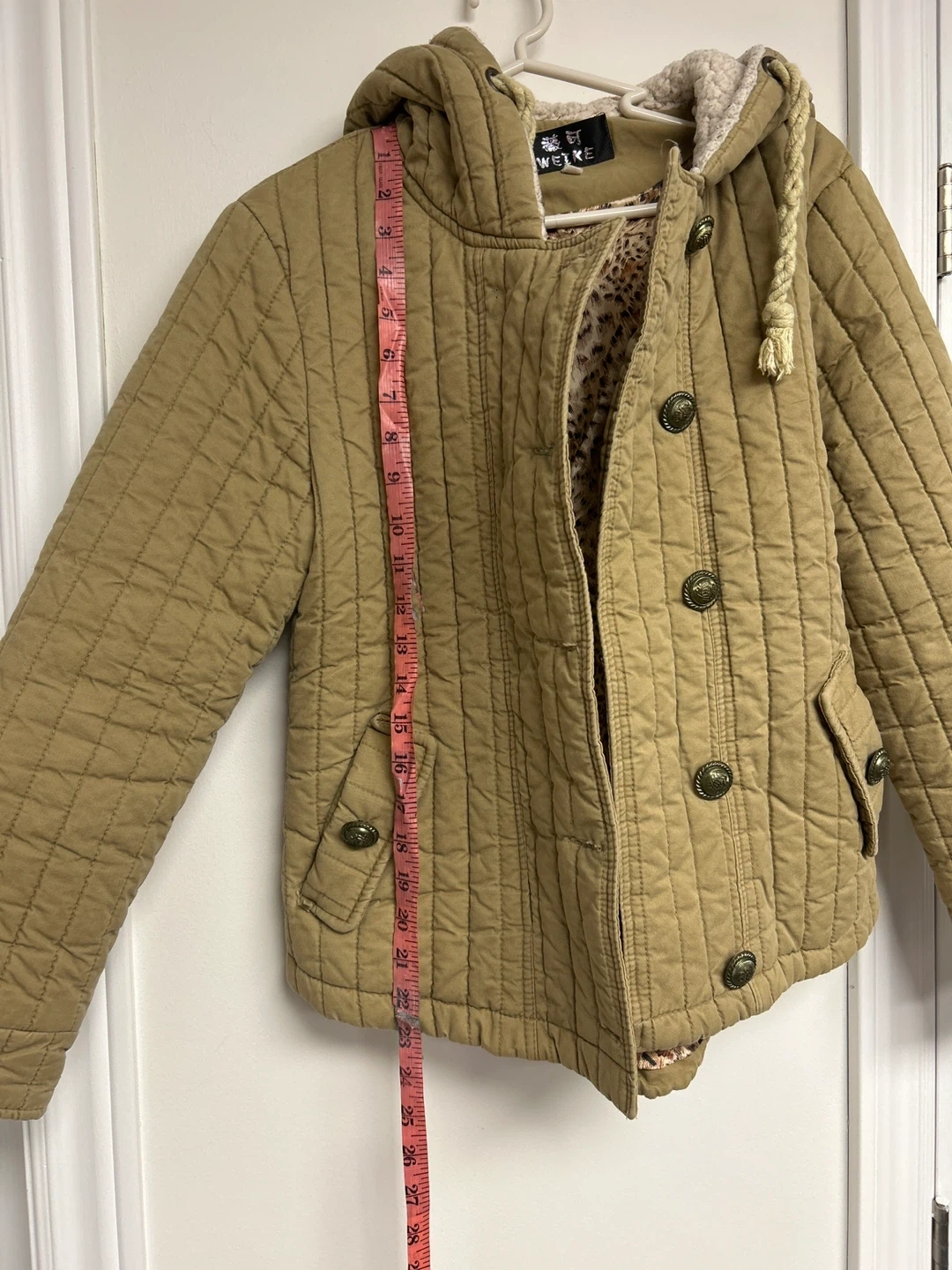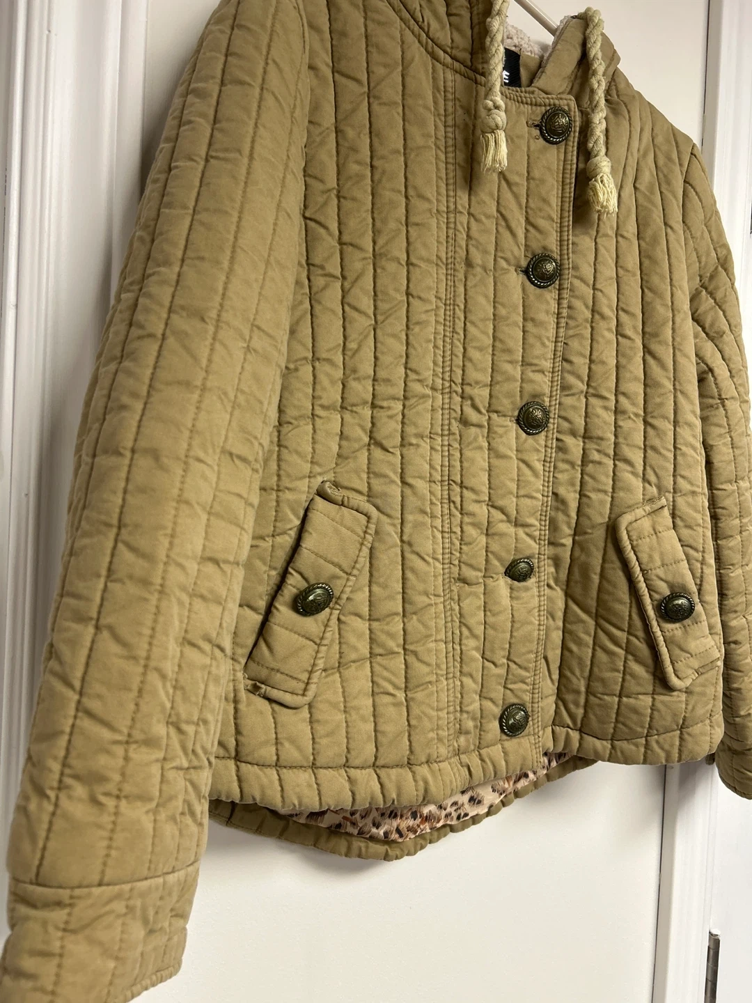 Quilted jacket in a tan colour with a hood and button closure. It has two front pockets and a leopard print lining. This jacket is great for cooler weather!