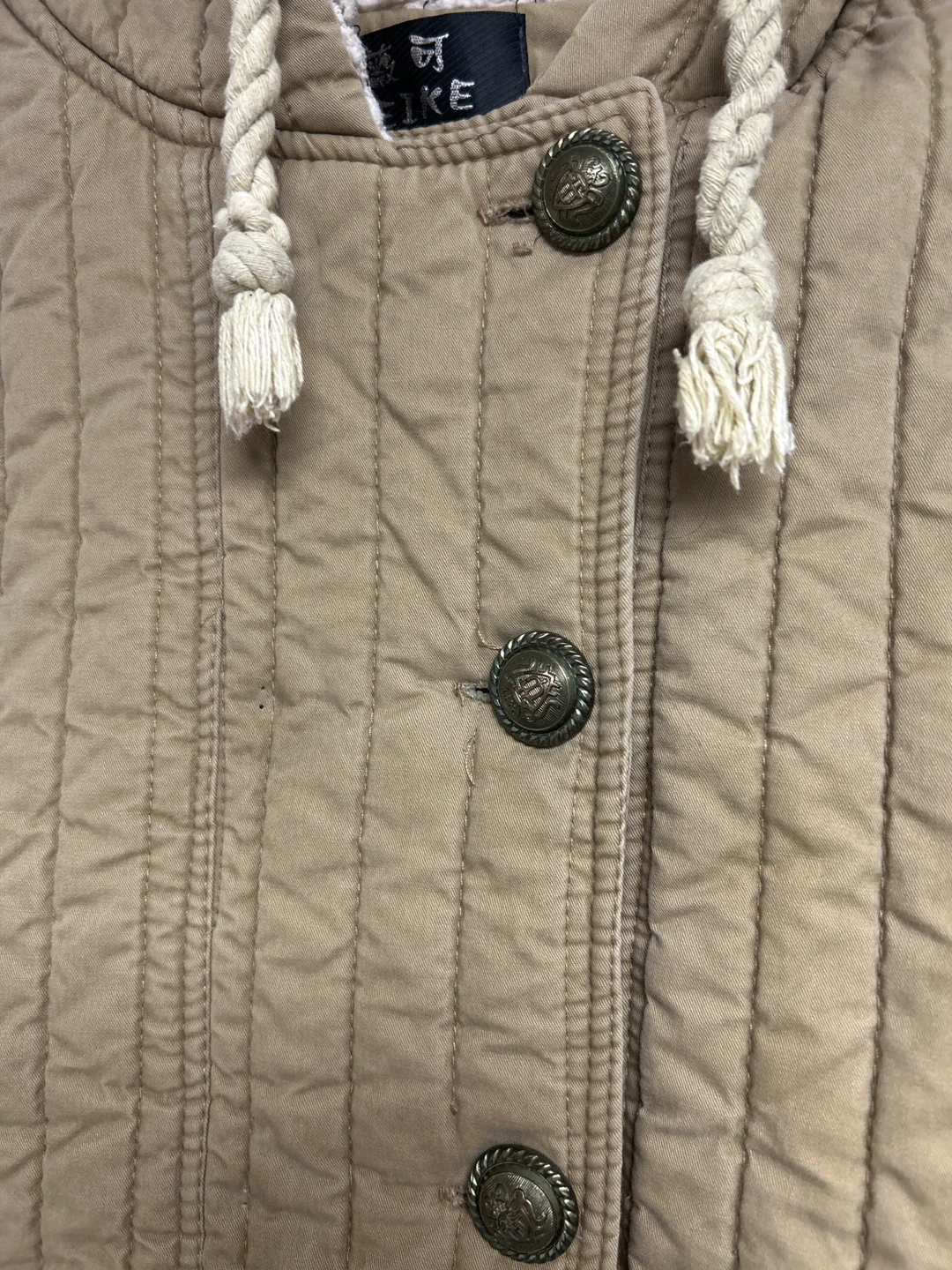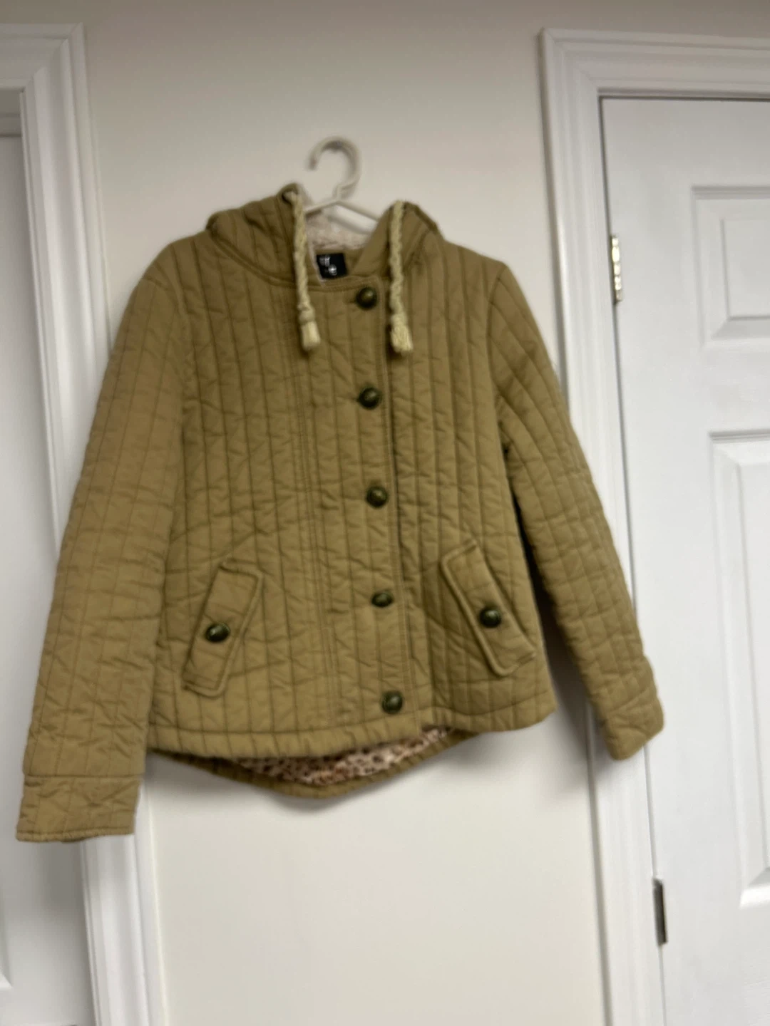 Quilted jacket in a tan colour with a hood and button closure. It has two front pockets and a leopard print lining. This jacket is great for cooler weather!