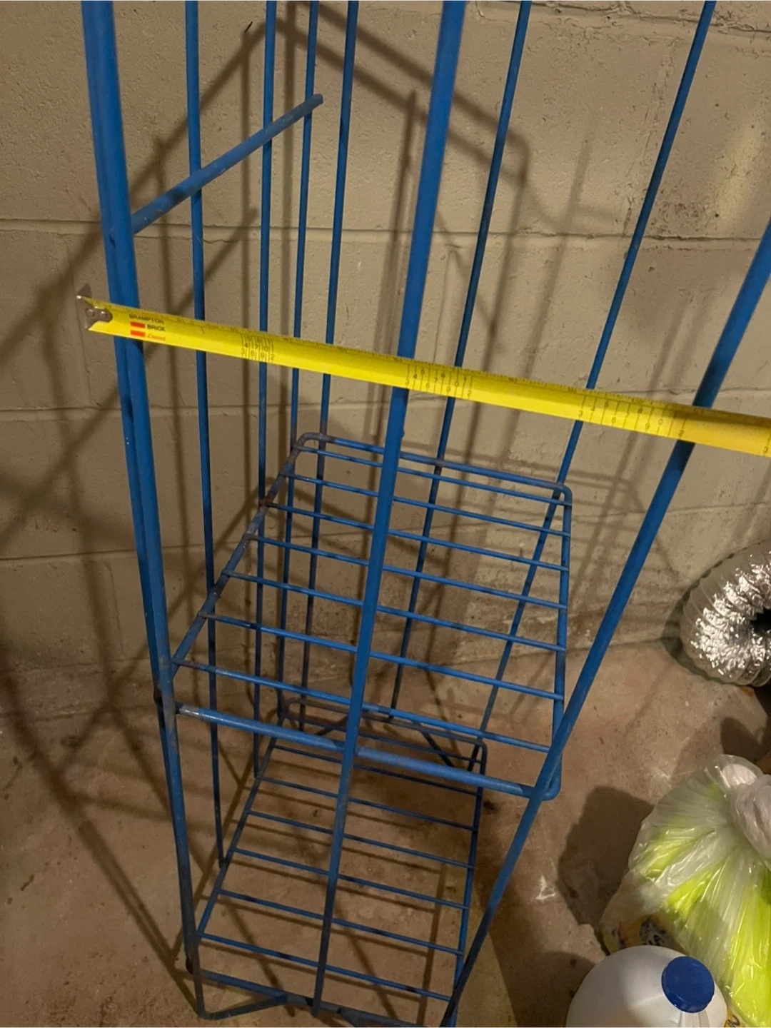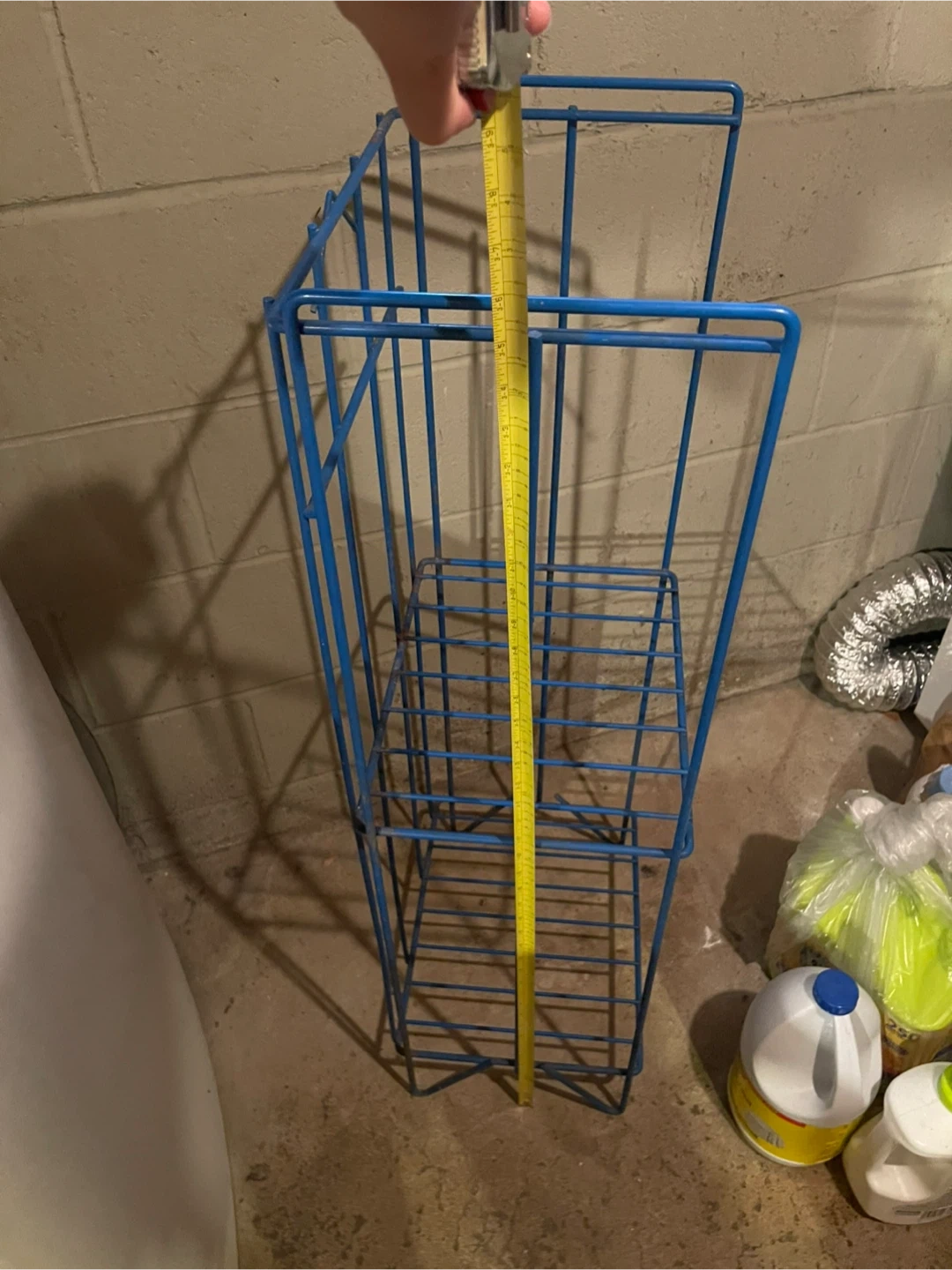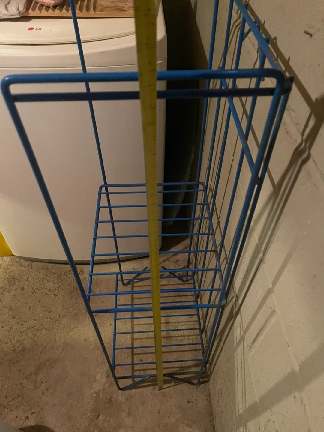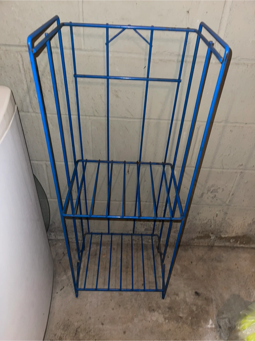 This is a blue wire storage rack with two shelves. It's made of metal wire. The rack is useful for organizing items in a basement or laundry room.
