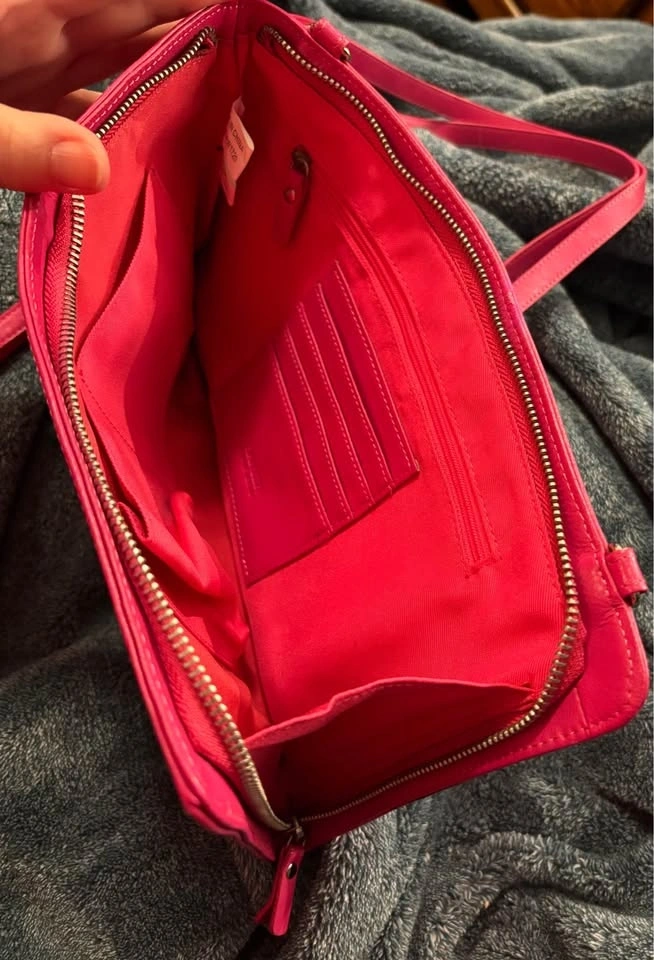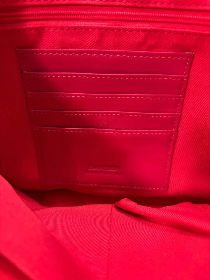 Pretty much like new. Fuchsia pink Danier genuine leather clutch purse. Has a shoulder strap or wristlet strap option. Zippered opening, one main compartment with card sleeves, two open pockets and one zippered pocket inside. Zippers all work great, no holes or snags. One pen mark inside, and very light edge wear on the outside. 11.75”x7.5”. Great little everyday clutch.