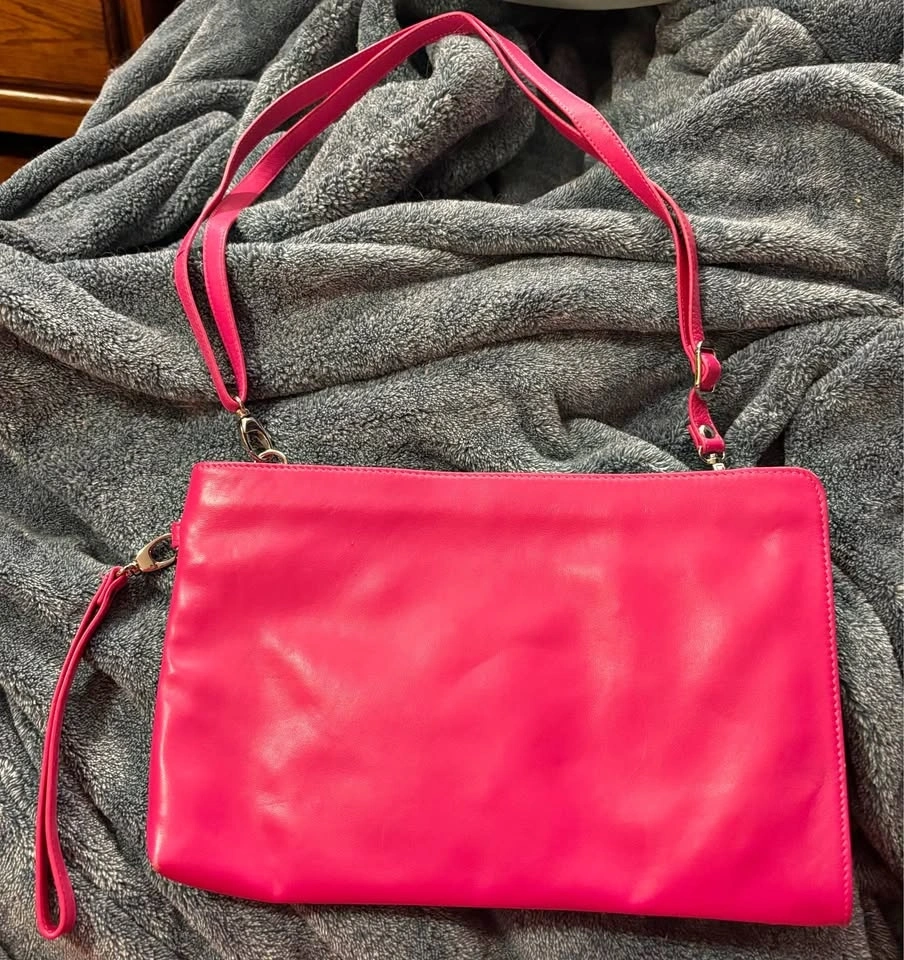 Pretty much like new. Fuchsia pink Danier genuine leather clutch purse. Has a shoulder strap or wristlet strap option. Zippered opening, one main compartment with card sleeves, two open pockets and one zippered pocket inside. Zippers all work great, no holes or snags. One pen mark inside, and very light edge wear on the outside. 11.75”x7.5”. Great little everyday clutch.
