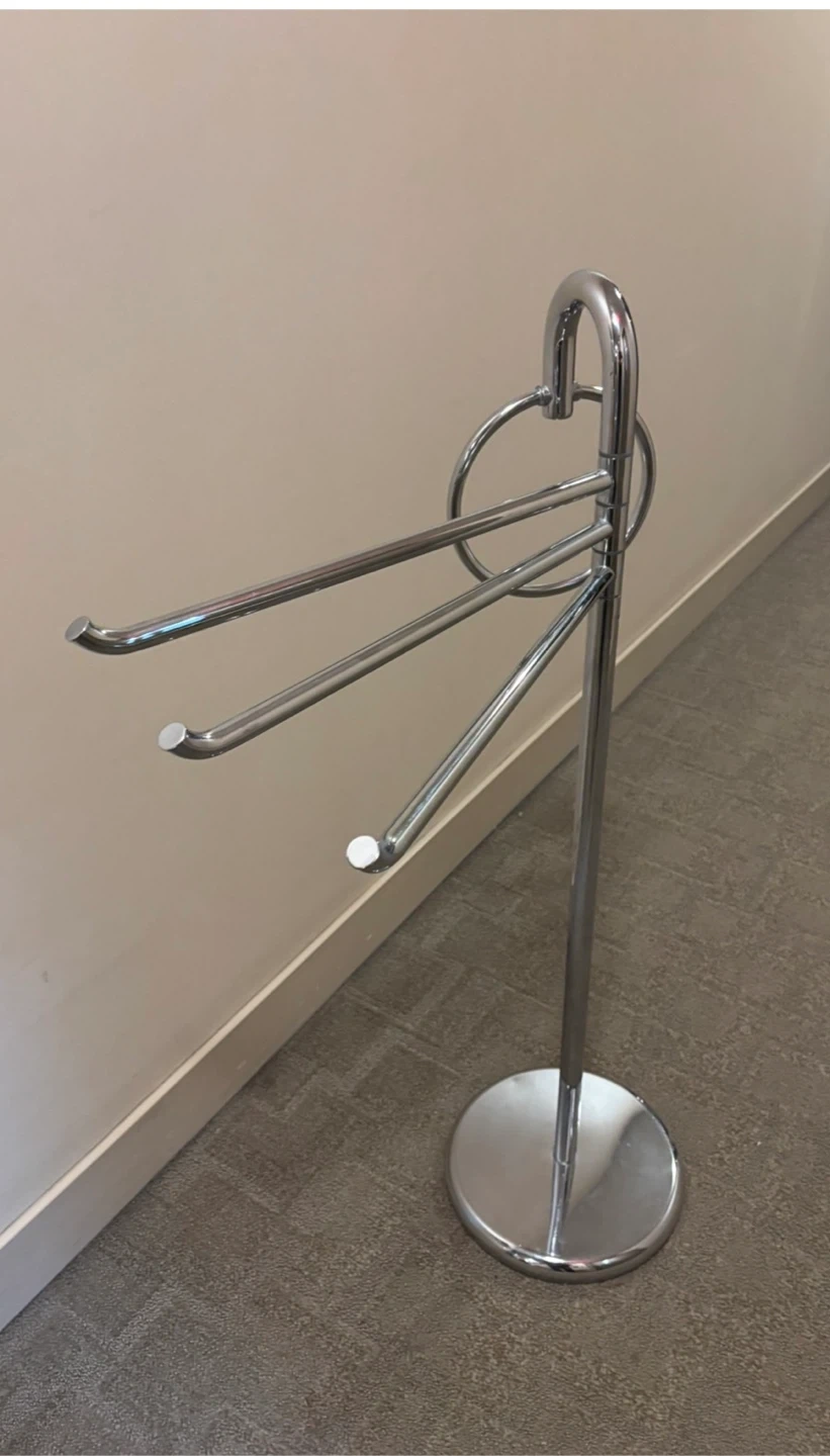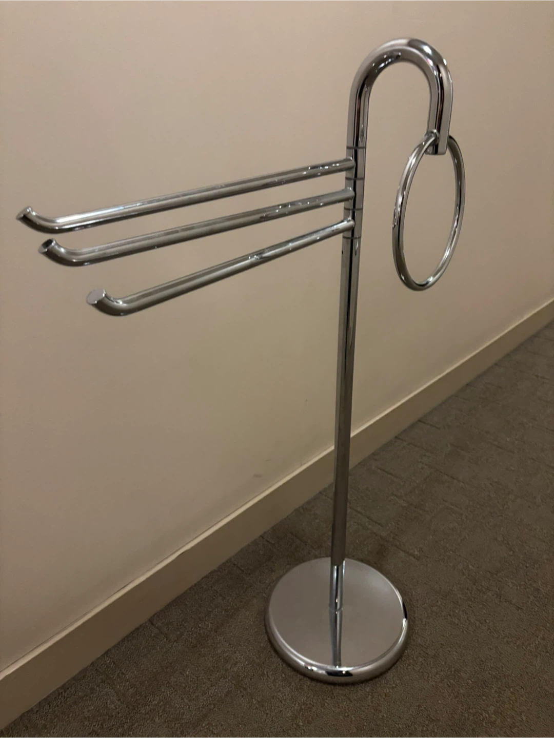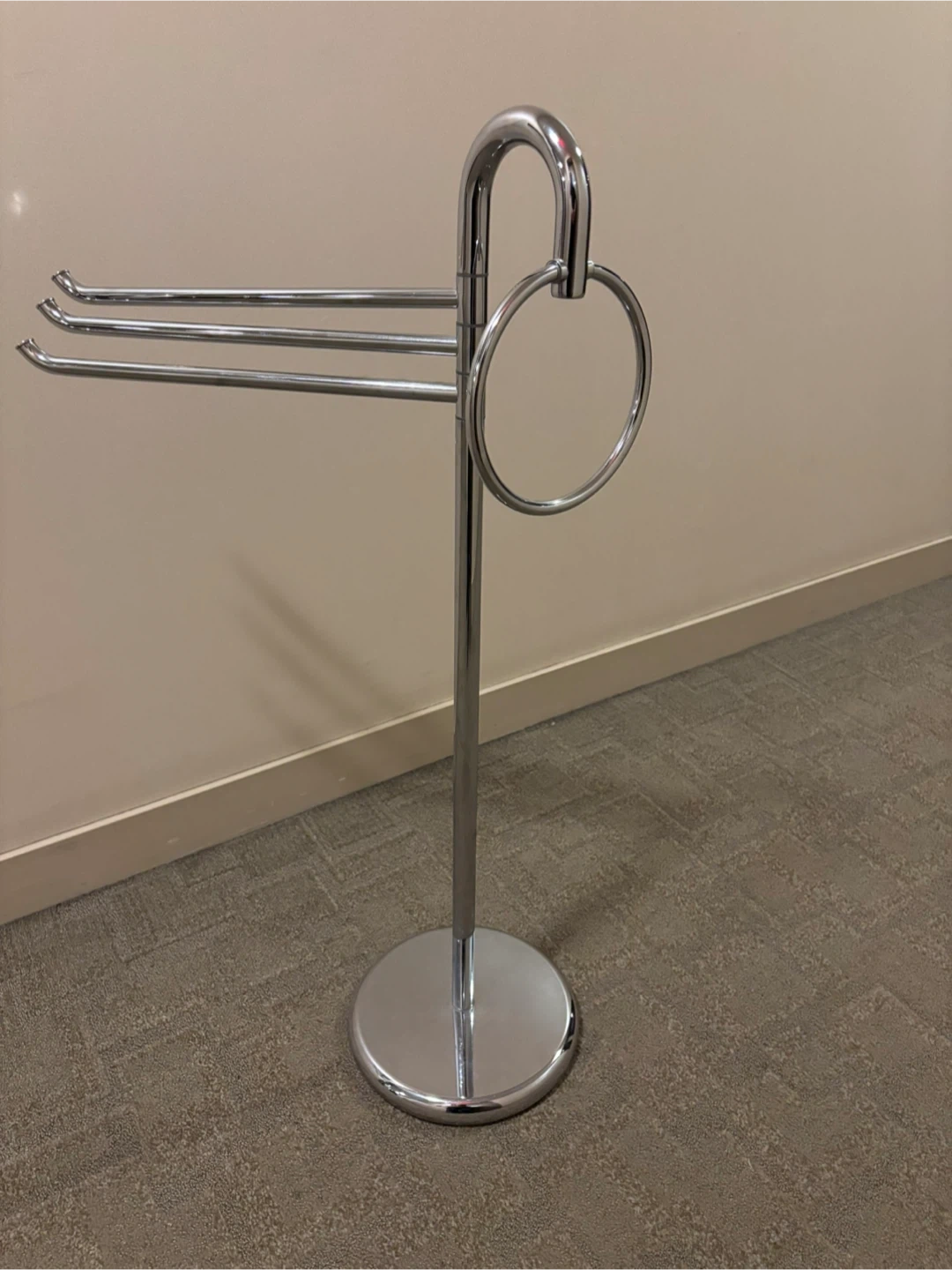 India Corella style freestanding chrome towel rack - mint condition - features a weighted round base for stability, three adjustable or swivel arms for hanging towels, and a circular towel ring - 3ft/96cm high - cash North Central Toronto, can deliver