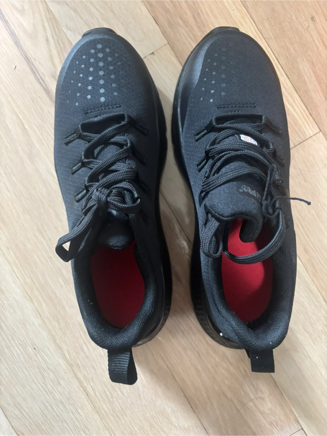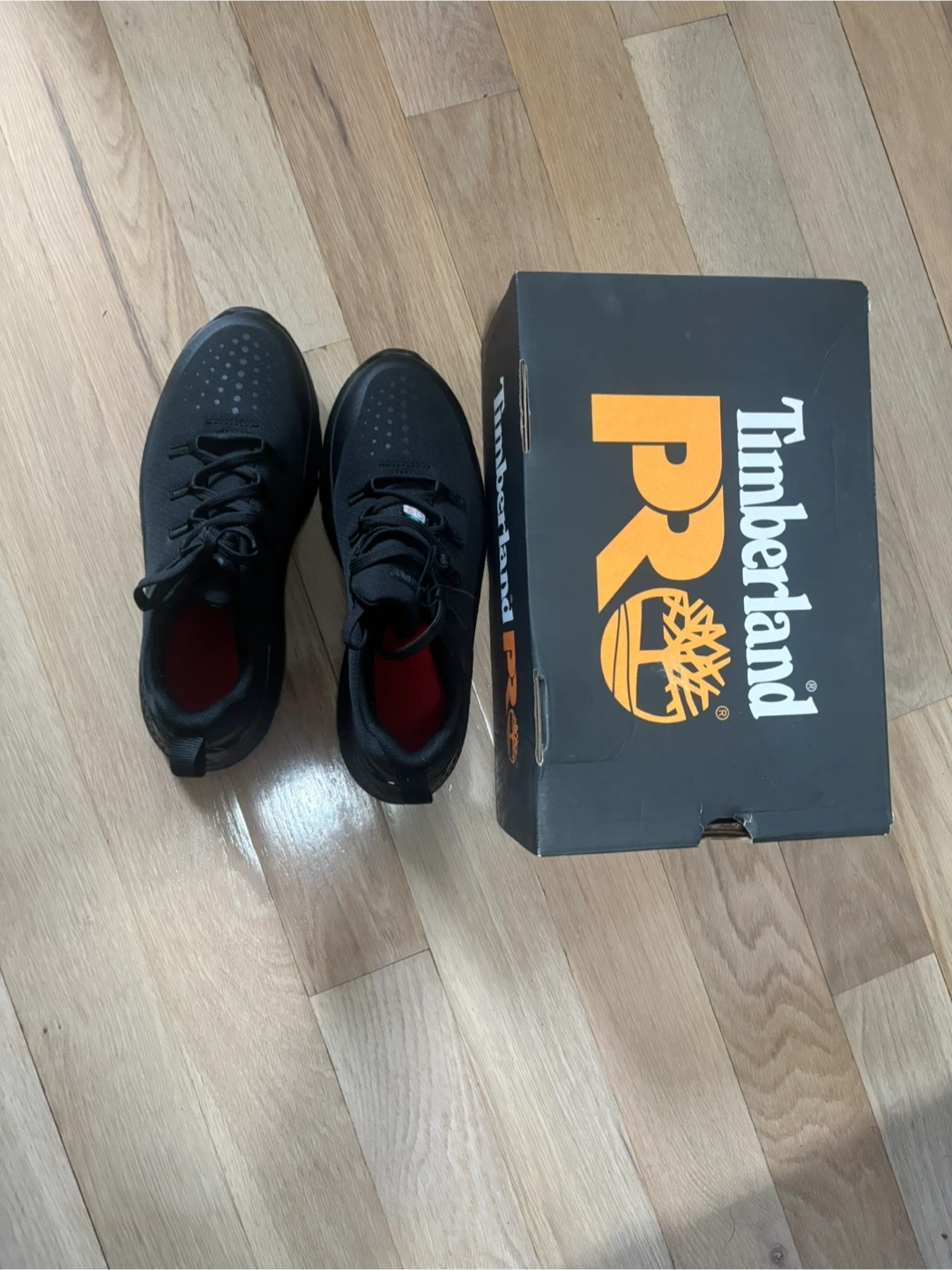 Available brand new Timberland PRO work steel toe shoes are black with red accents inside. They're athletic-style and come with the original box. They're built for durability and comfort on the job .