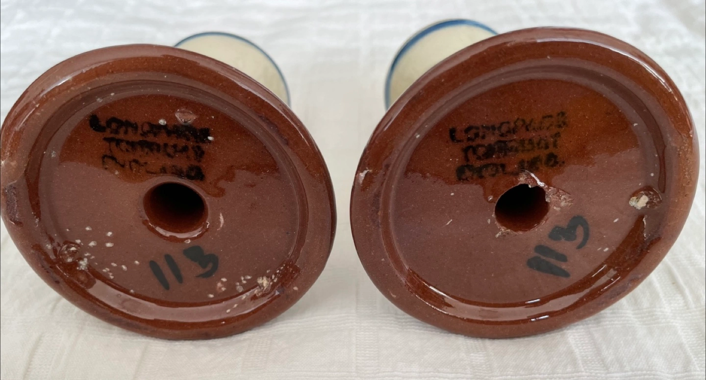 Here's a charming pair of Longpark Torquay candle holders from England! They feature a quaint house design and a lovely blue and brown trim. Perfect for adding a touch of vintage charm to your home decor. Like new, mint condition.