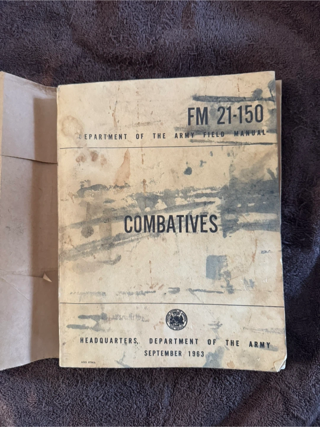 Selling a copy of FM 21-150, a Department of the Army Field Manual focused on Combatives. This manual was published in September 1963 and covers topics such as bayonet assault course targets, obstacles, and scoresheets, as well as advice to instructors of bayonet training and hand-to-hand combat.