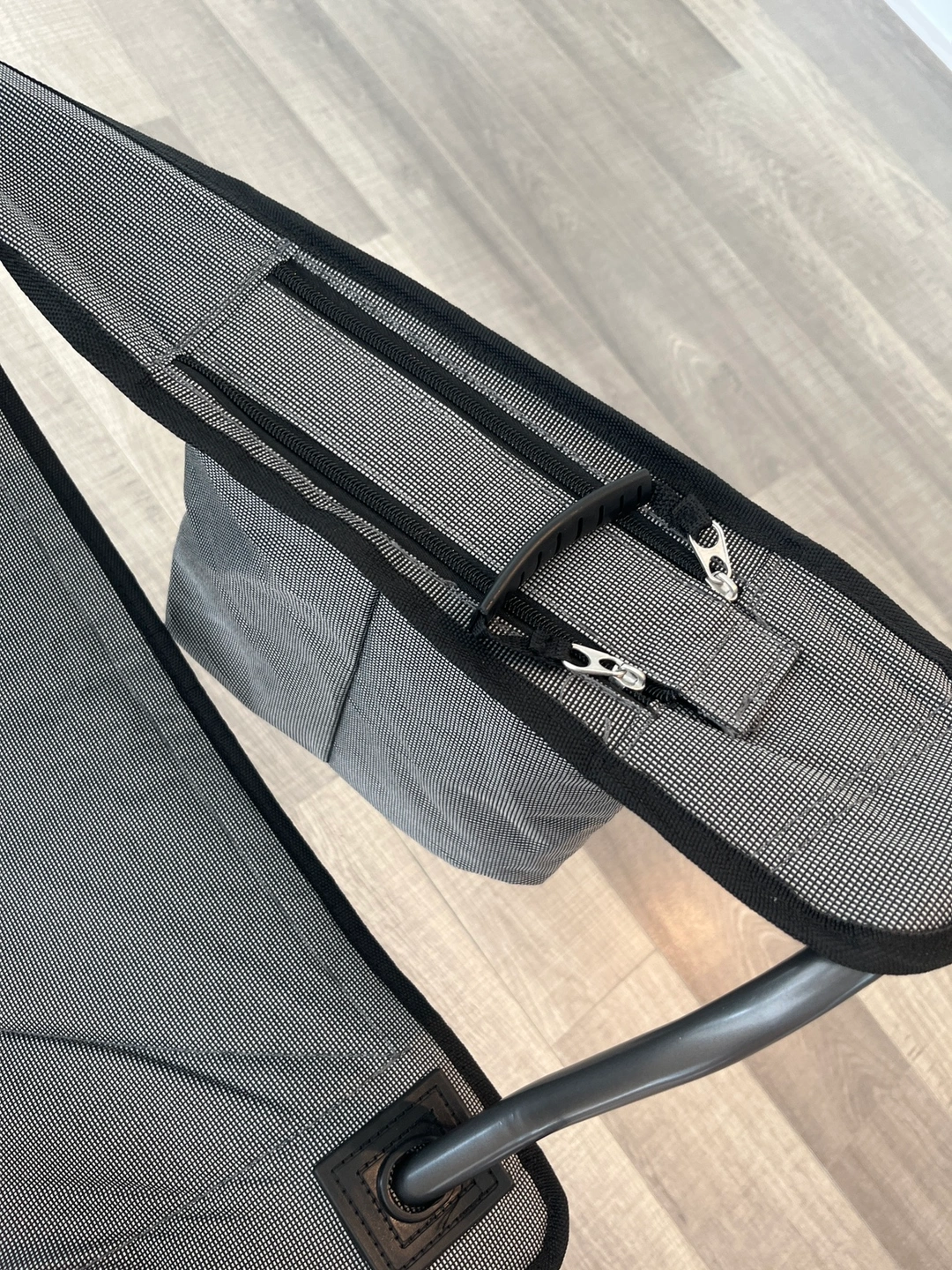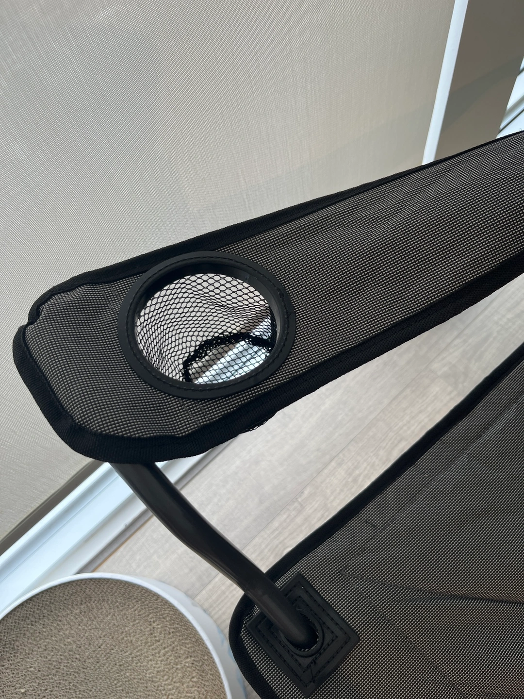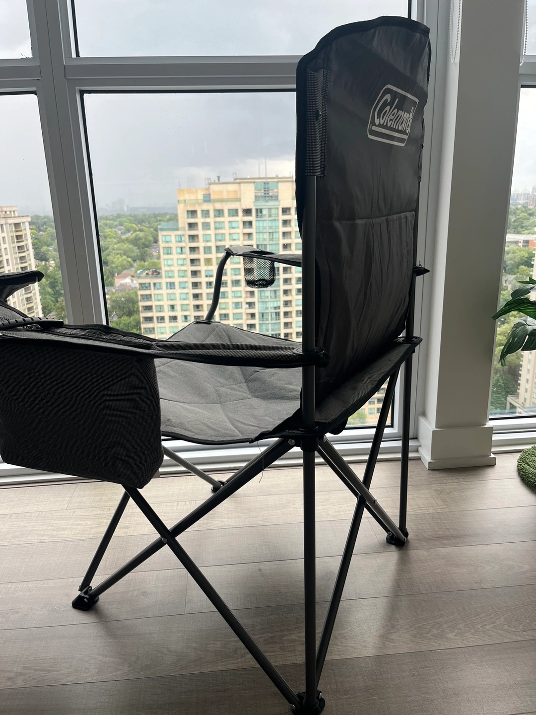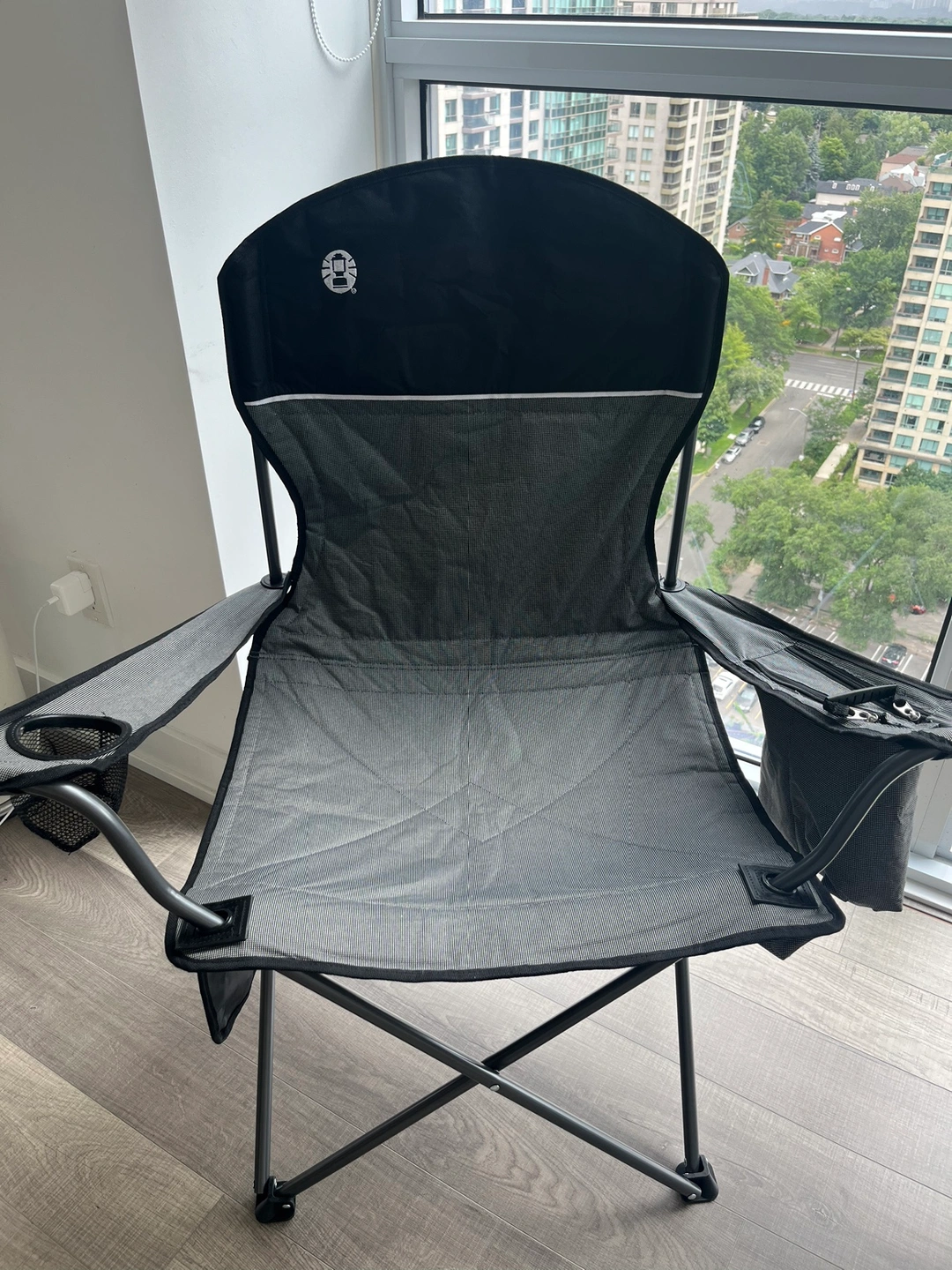 A folding camping chair with armrests and side pockets. Super spacious and comfy.