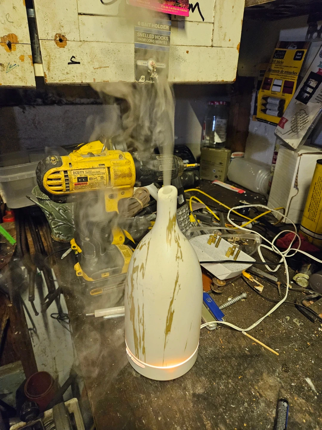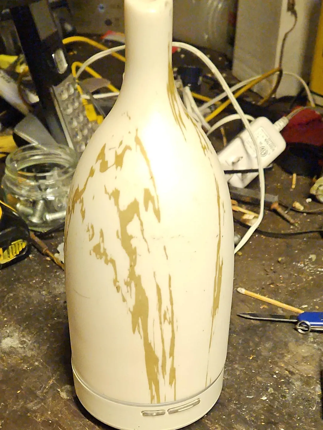 This aroma diffuser has a white base with a unique gold marble-like pattern. It's powered by an electrical cord. It adds a decorative touch to any room.