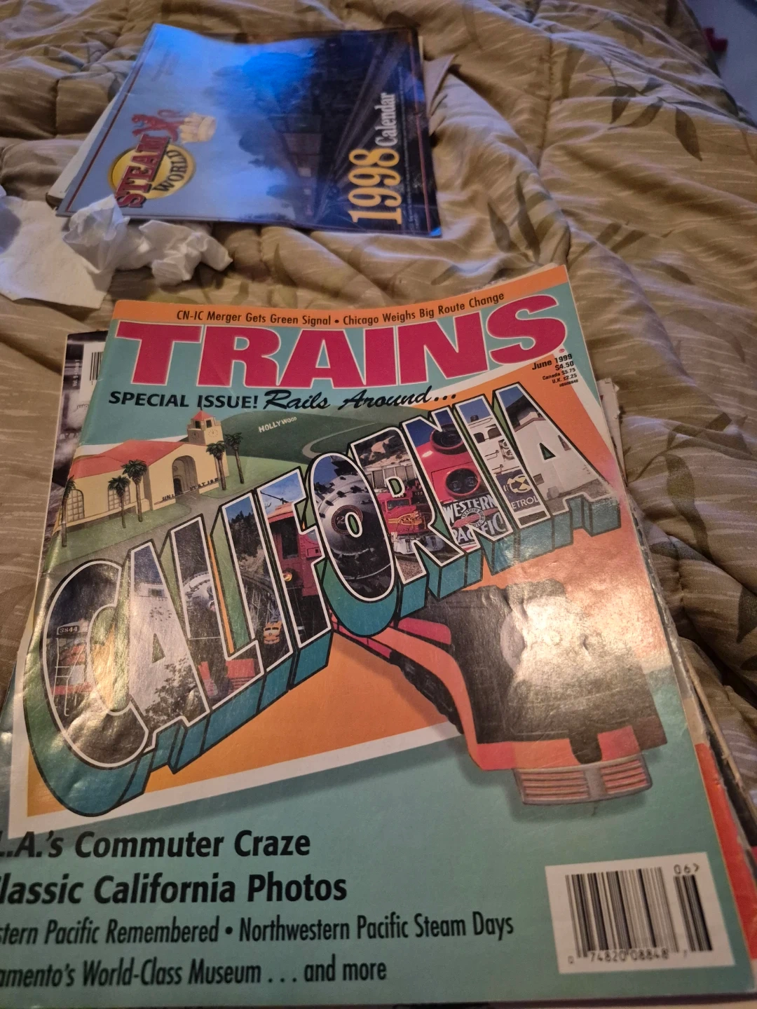 This special issue of Trains Magazine features "Rails Around California." It includes articles on L.A.'s commuter craze, classic California photos, and the Western Pacific Railroad. This magazine is from June 1999.