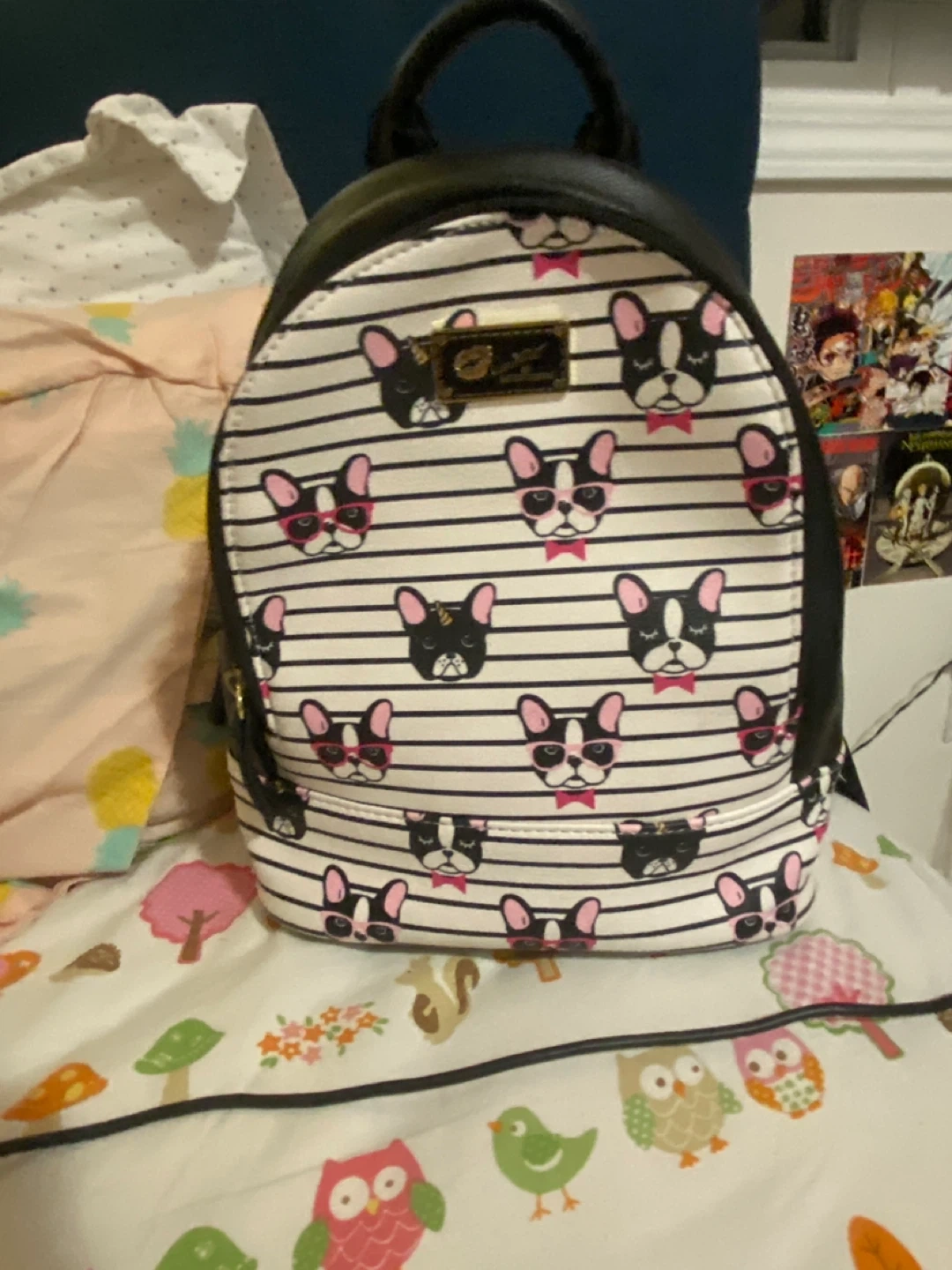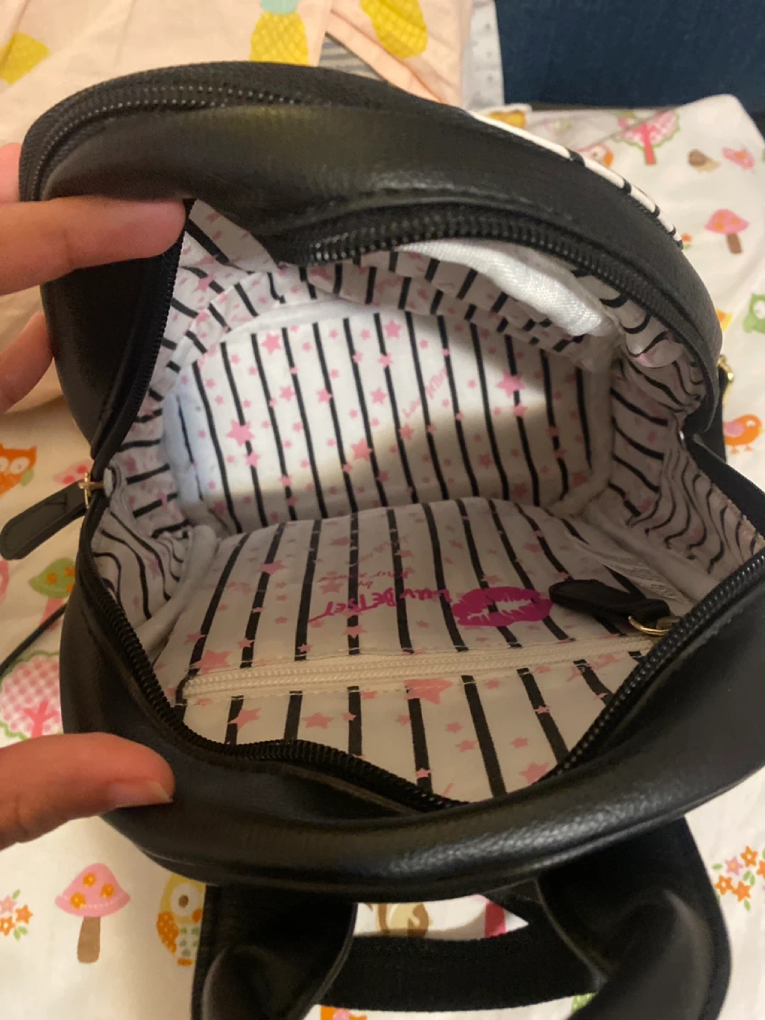 This is a cute Betsey Johnson black small backpack. It has a striped interior with pink stars and a small zipper pocket. The exterior has a dog print on the front and straps with the brand name on the back.