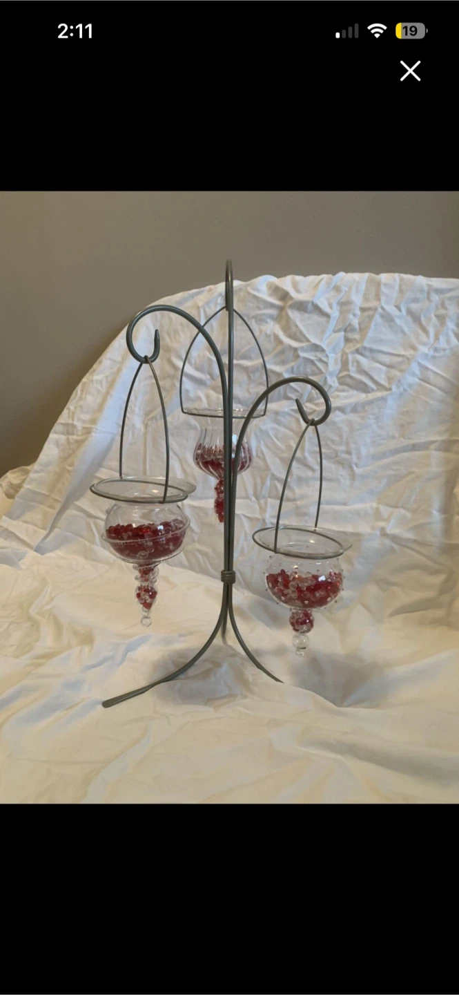 Partylite hanging ice crystals tea light holder with red and clear beads. This glass tree features three hanging glass bowls, perfect for displaying decorative stones, or other small items. It adds a touch of elegance and whimsy to any room, and it's sure to be a conversation starter