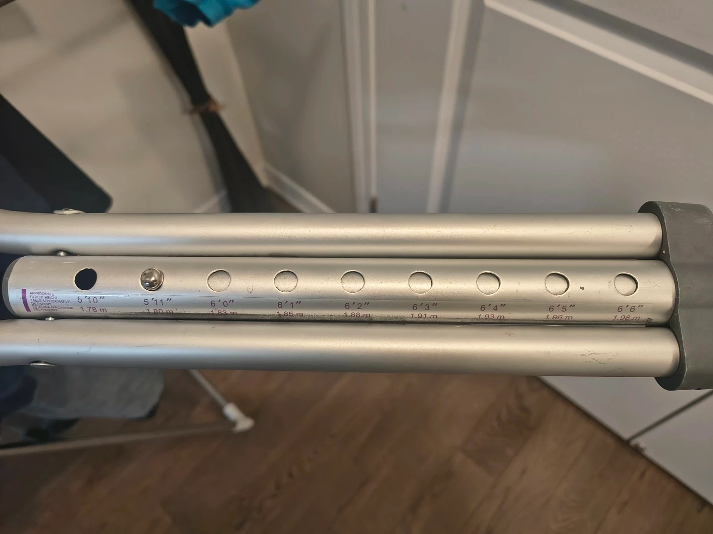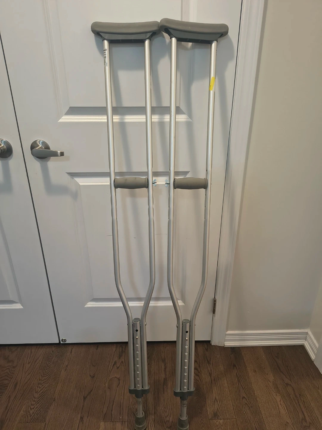 These are a pair of adjustable aluminum crutches. They have padded handgrips for comfort. The height can be adjusted to suit users between 5'10" and 6'6".