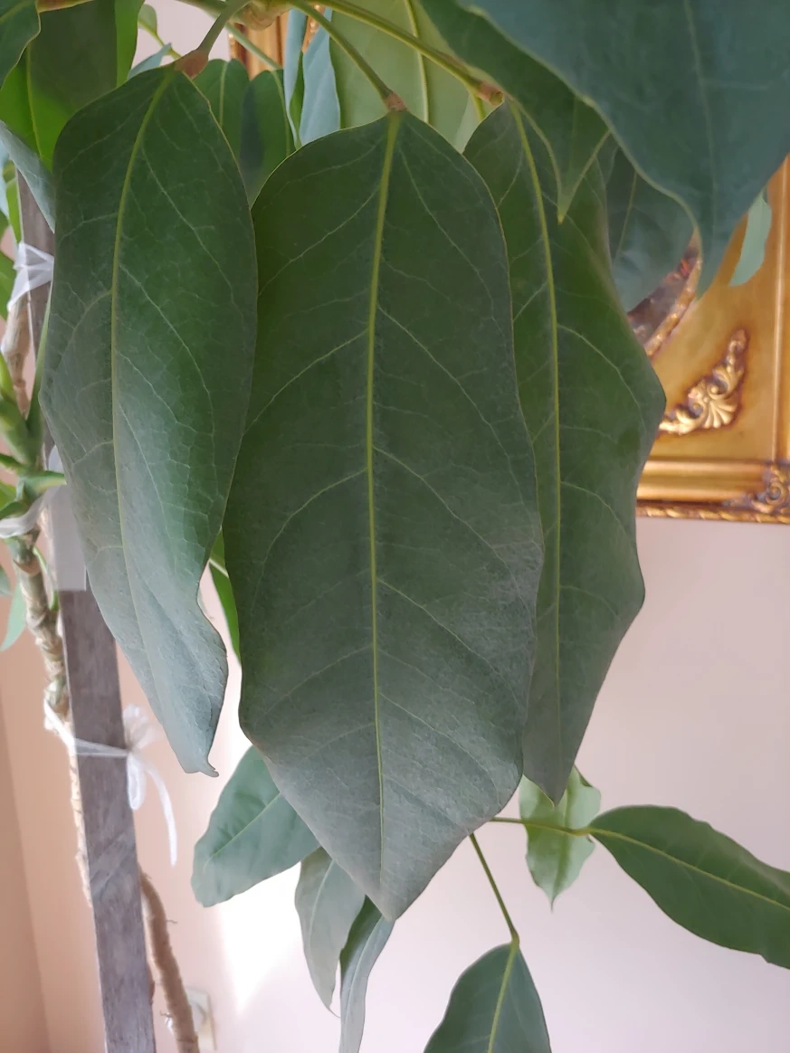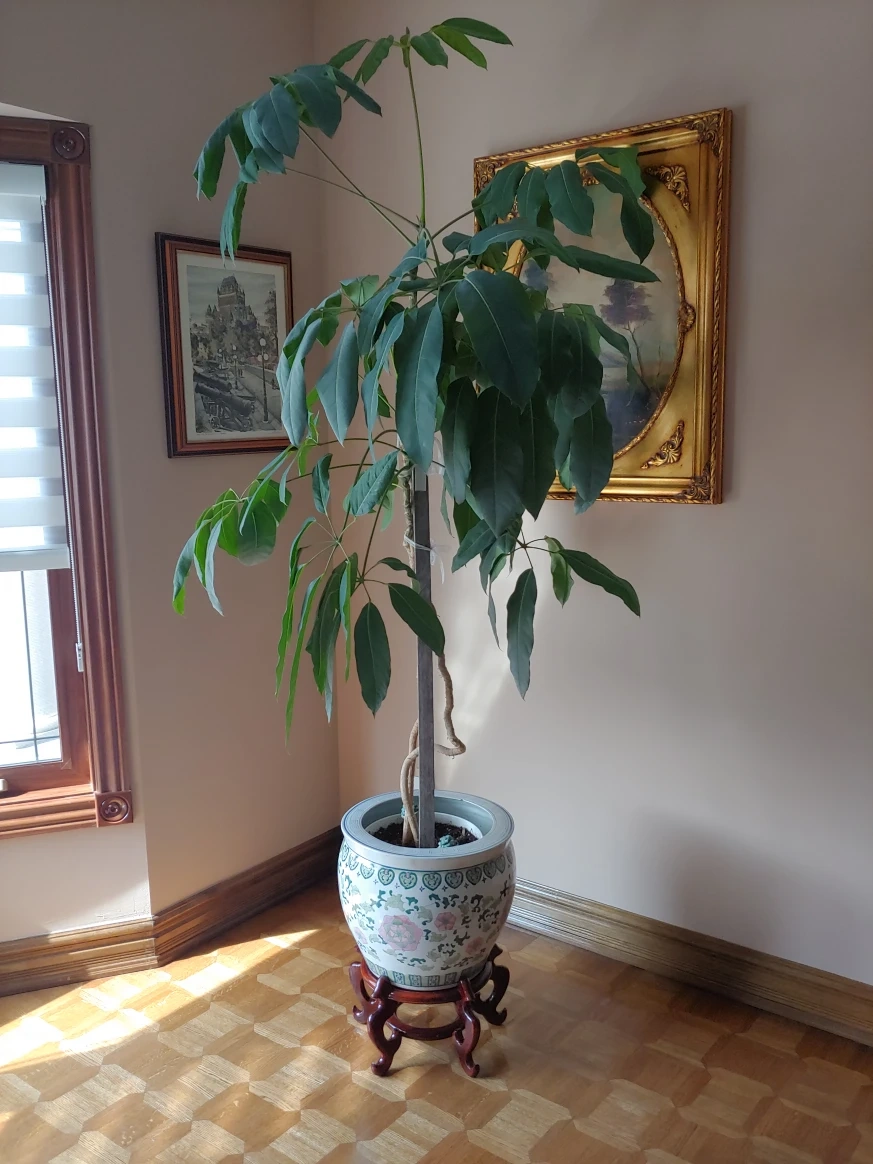 Potted Ficus Plant in ceramic pot that sits on a wooden platform. pot has small chip. plant is 67" tall and pot is 16.5" wide by 14" tall