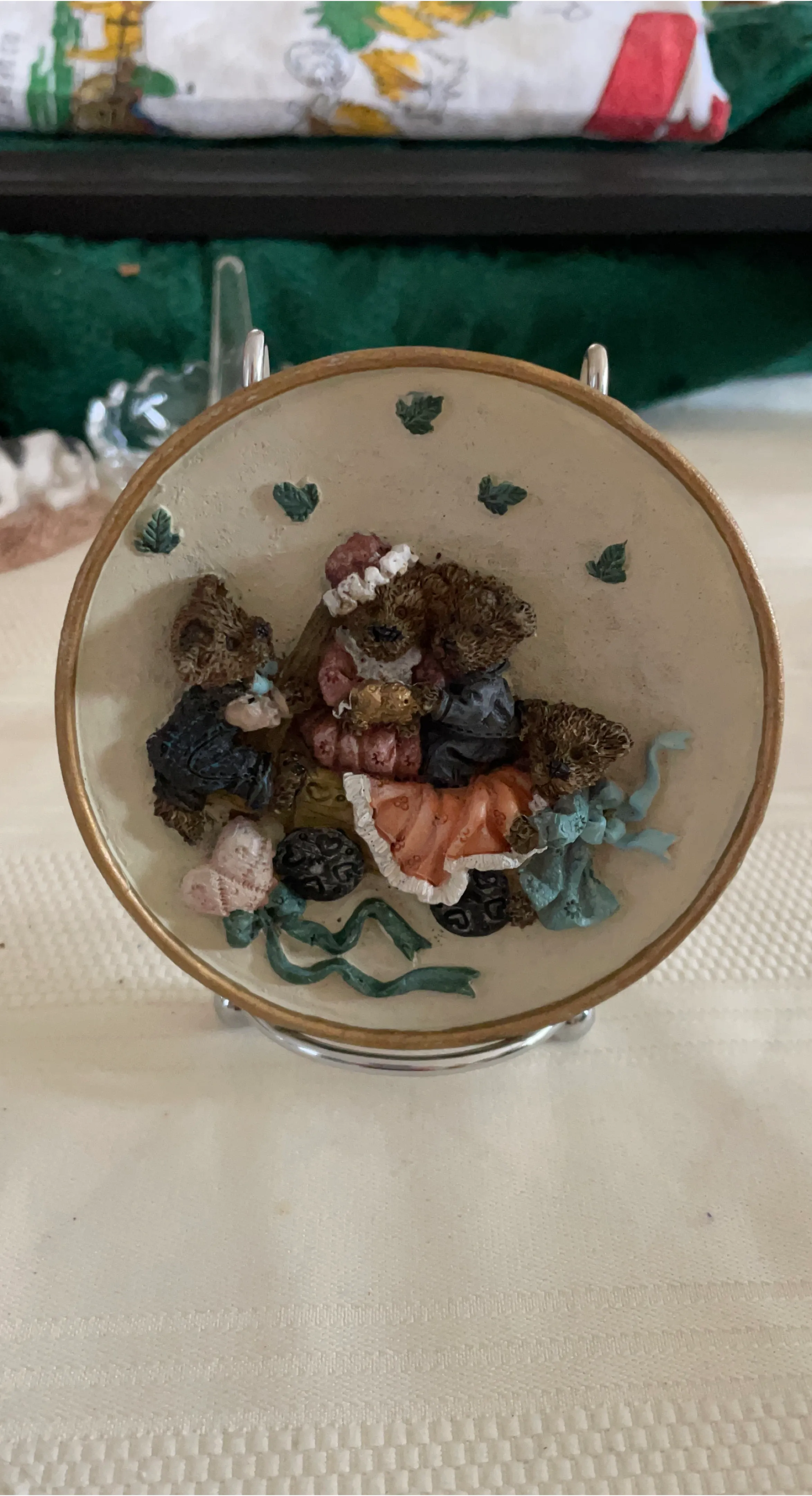 This decorative plate features a charming scene of teddy bears in festive attire. It's made from resin with a detailed, sculpted design. This piece would add a touch of whimsy to any shelf or display area! This can be hang too. Free stand.