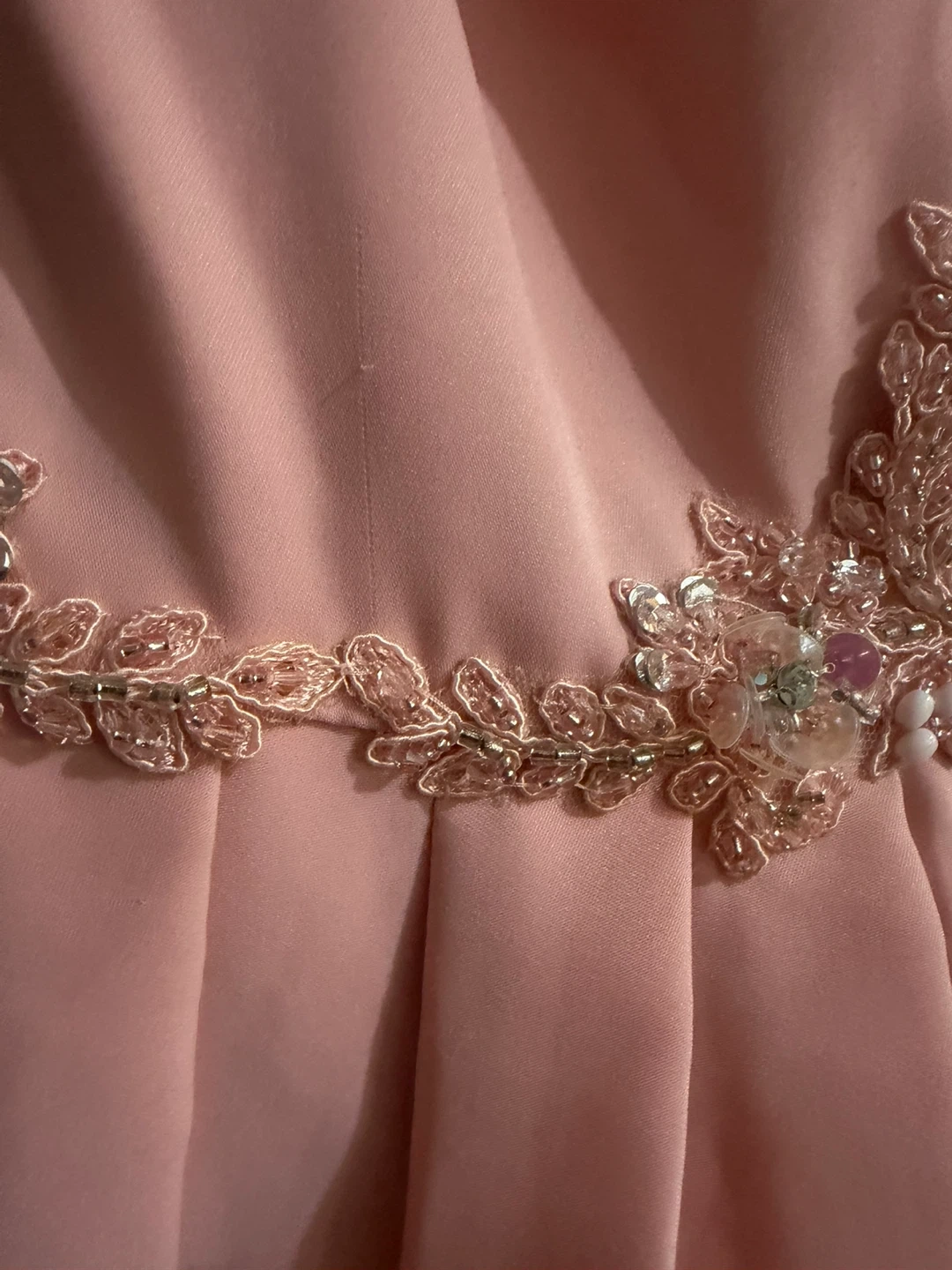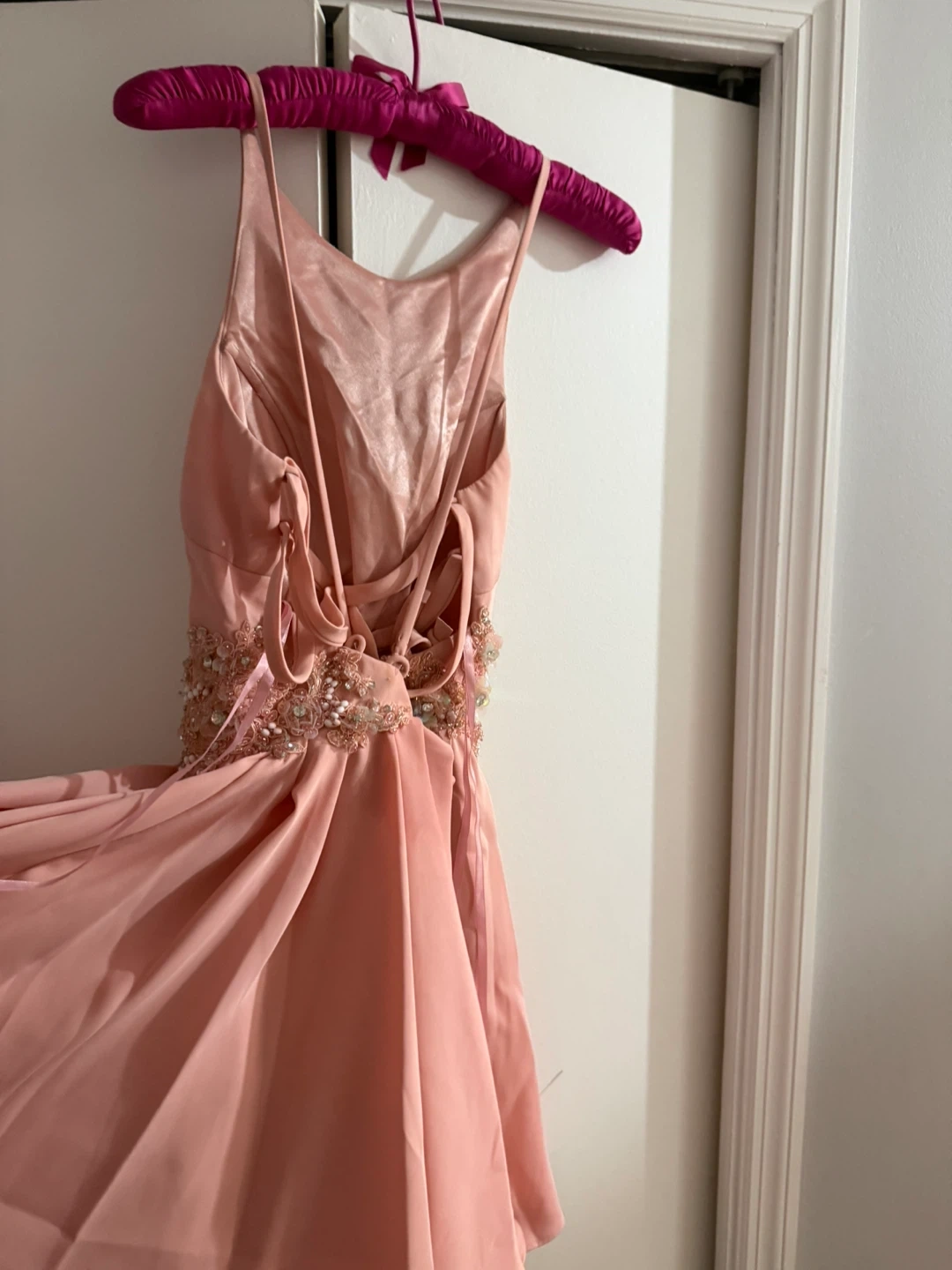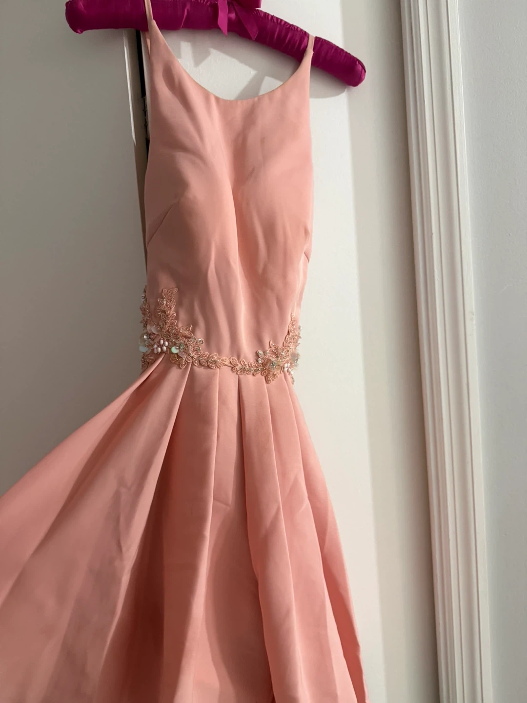 This pretty pink skort dress features delicate beading and embellishments around the waist. It has a flattering A-line skirt and adjustable tie back. Perfect for homecoming or a special occasion!