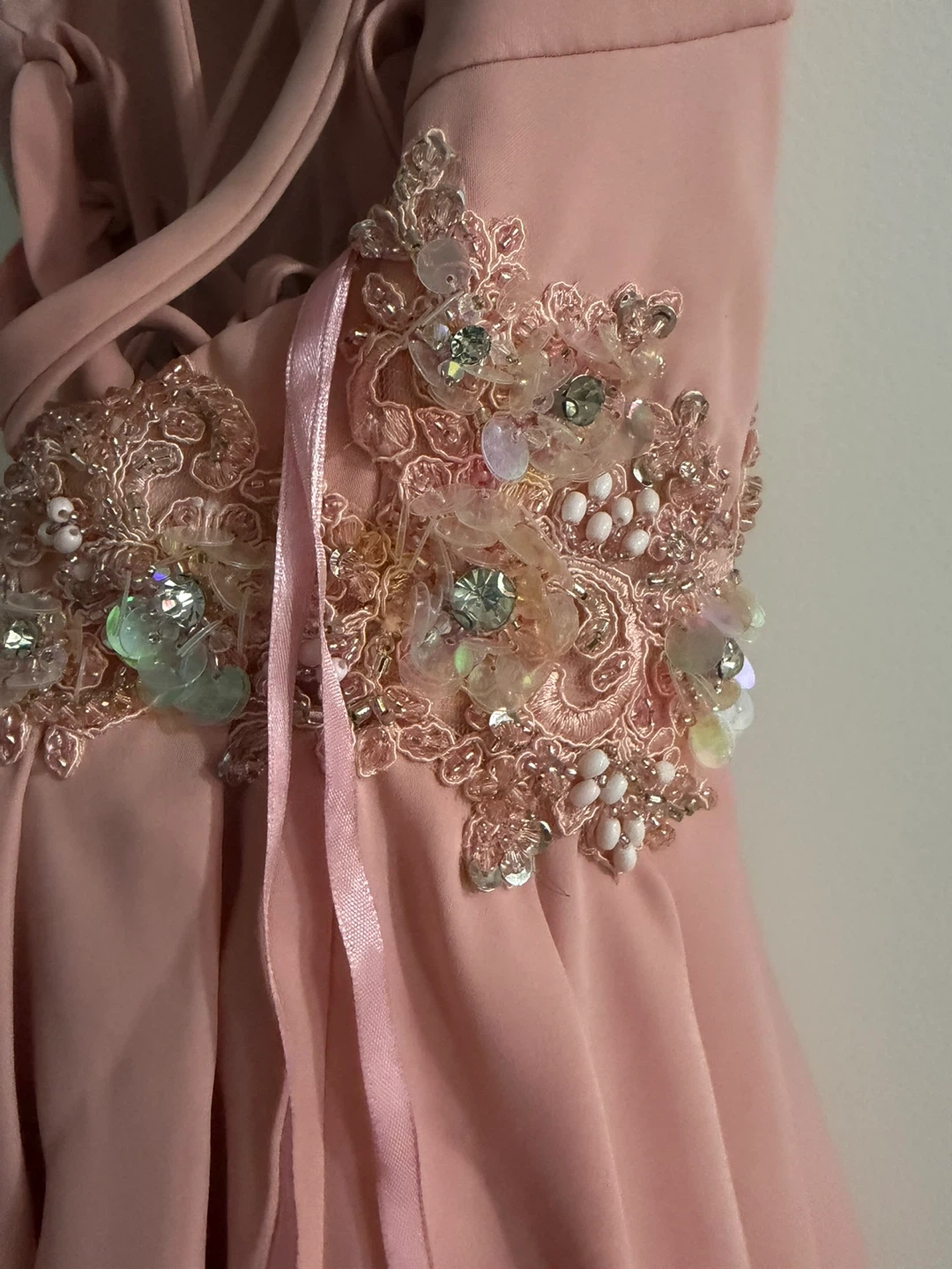 This pretty pink skort dress features delicate beading and embellishments around the waist. It has a flattering A-line skirt and adjustable tie back. Perfect for homecoming or a special occasion!