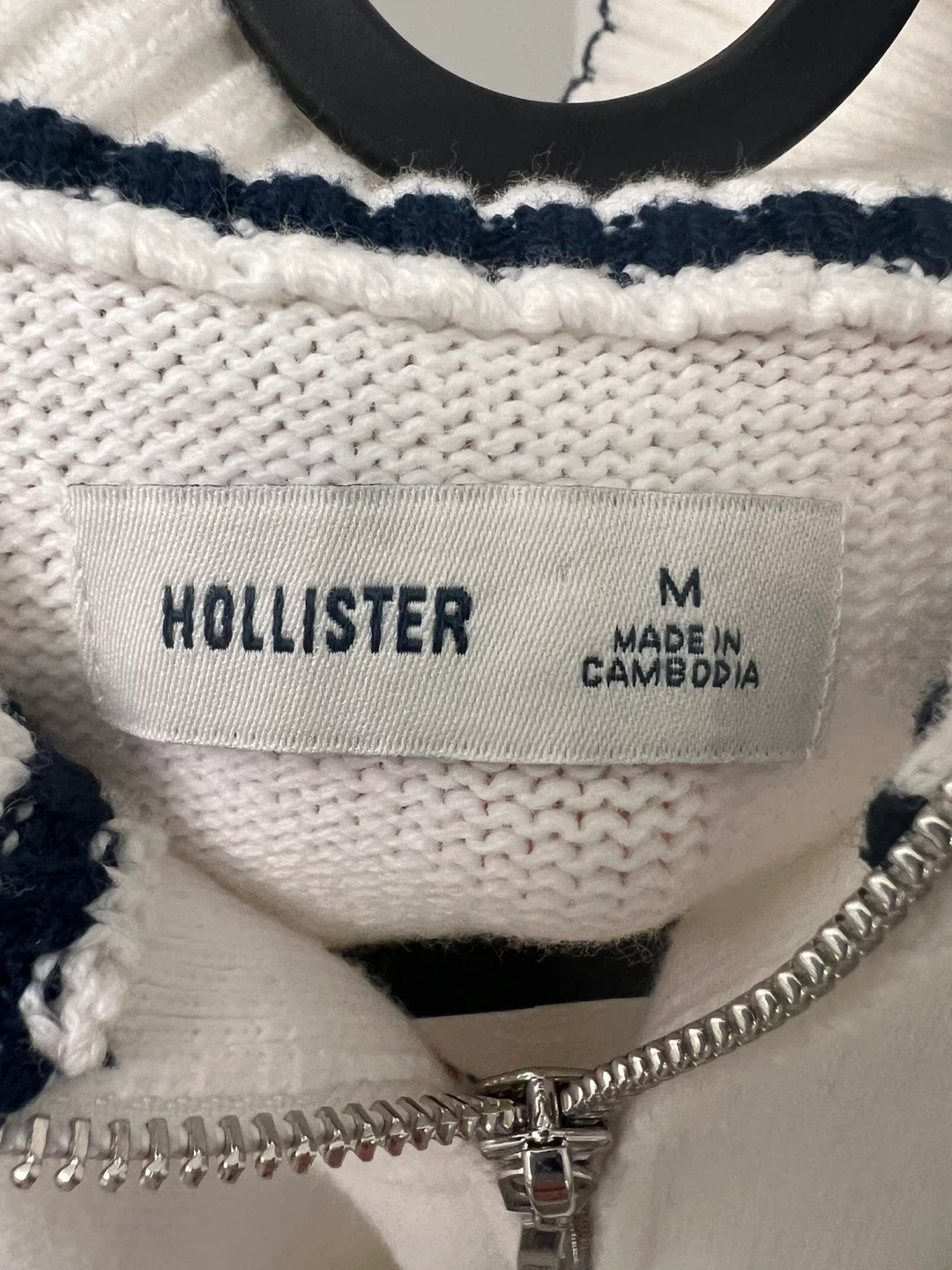White Hollister sweater with "USA" graphic on the front and an American flag on the back. It's a women's medium size with a half-zip closure and a mock neck. Made in Cambodia.