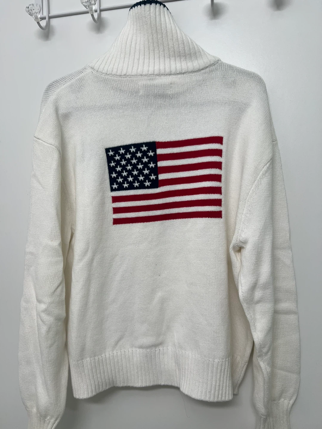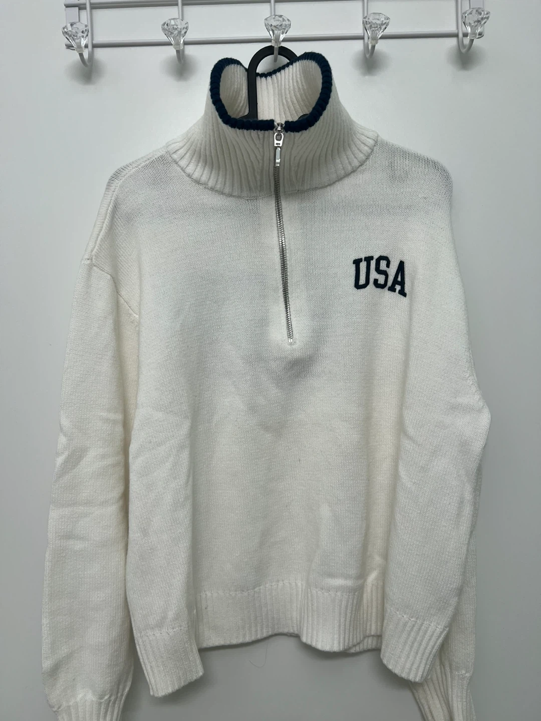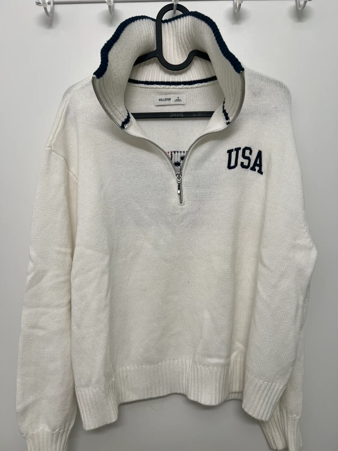 White Hollister sweater with "USA" graphic on the front and an American flag on the back. It's a women's medium size with a half-zip closure and a mock neck. Made in Cambodia.