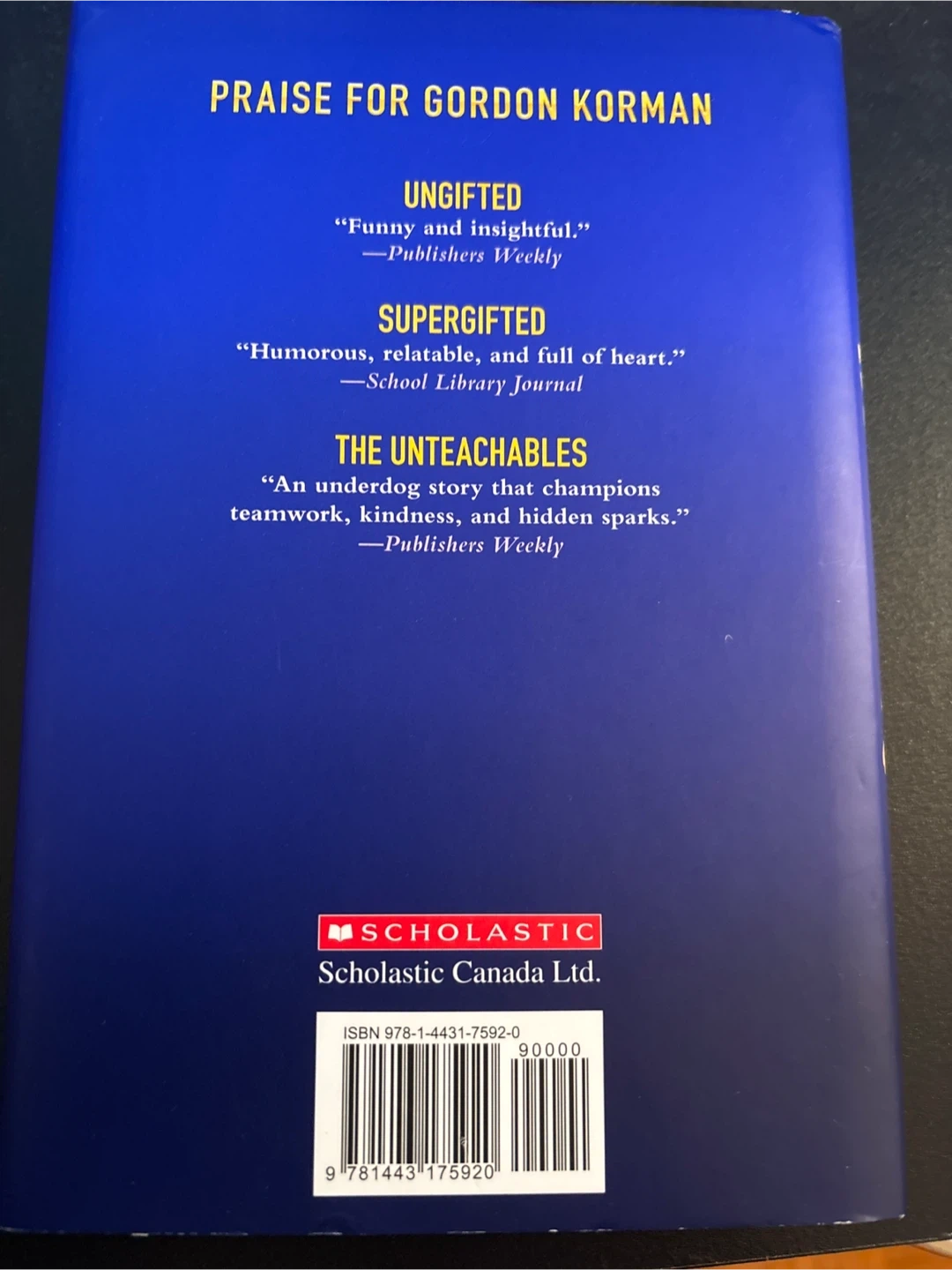 This is the book "Notorious" by Gordon Korman. It's a novel by the #1 New York Times bestselling author. Scholastic Canada Ltd. published this book.