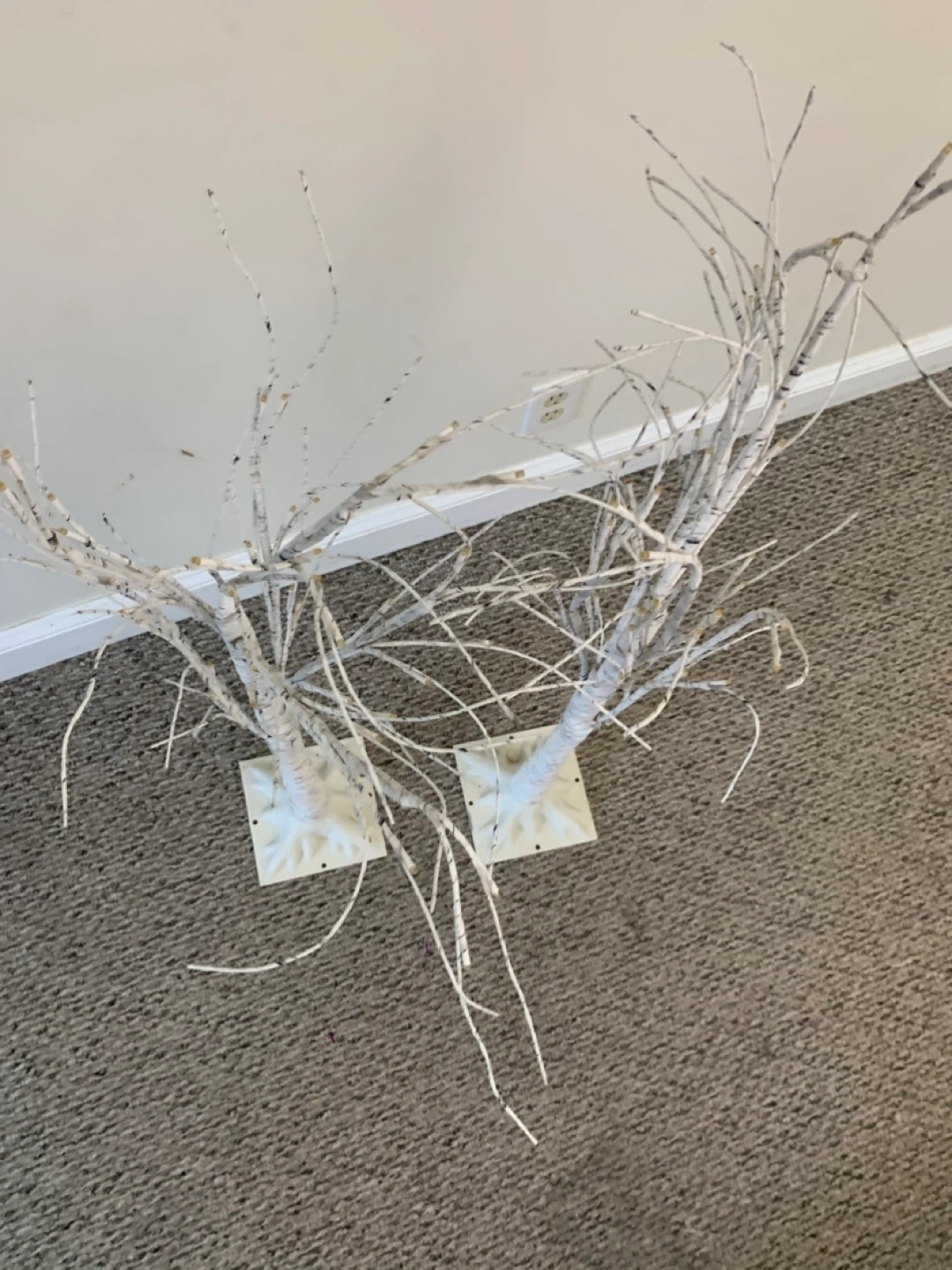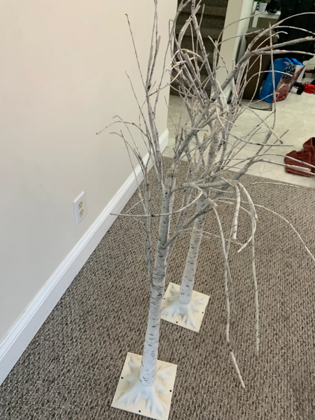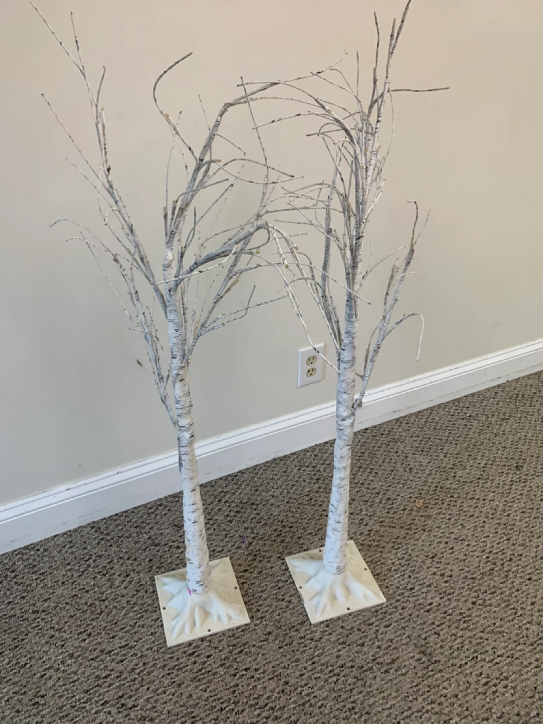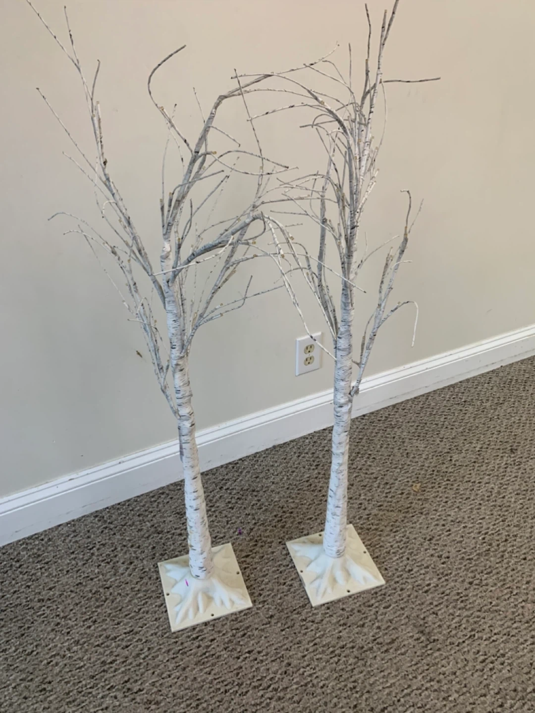 This is a set of two decorative white birch trees. They have a realistic bark texture and delicate branches, perfect for adding a wintery or natural touch to your decor. Each tree stands on a square base for stability. They're great for holiday displays or year-round accent pieces!