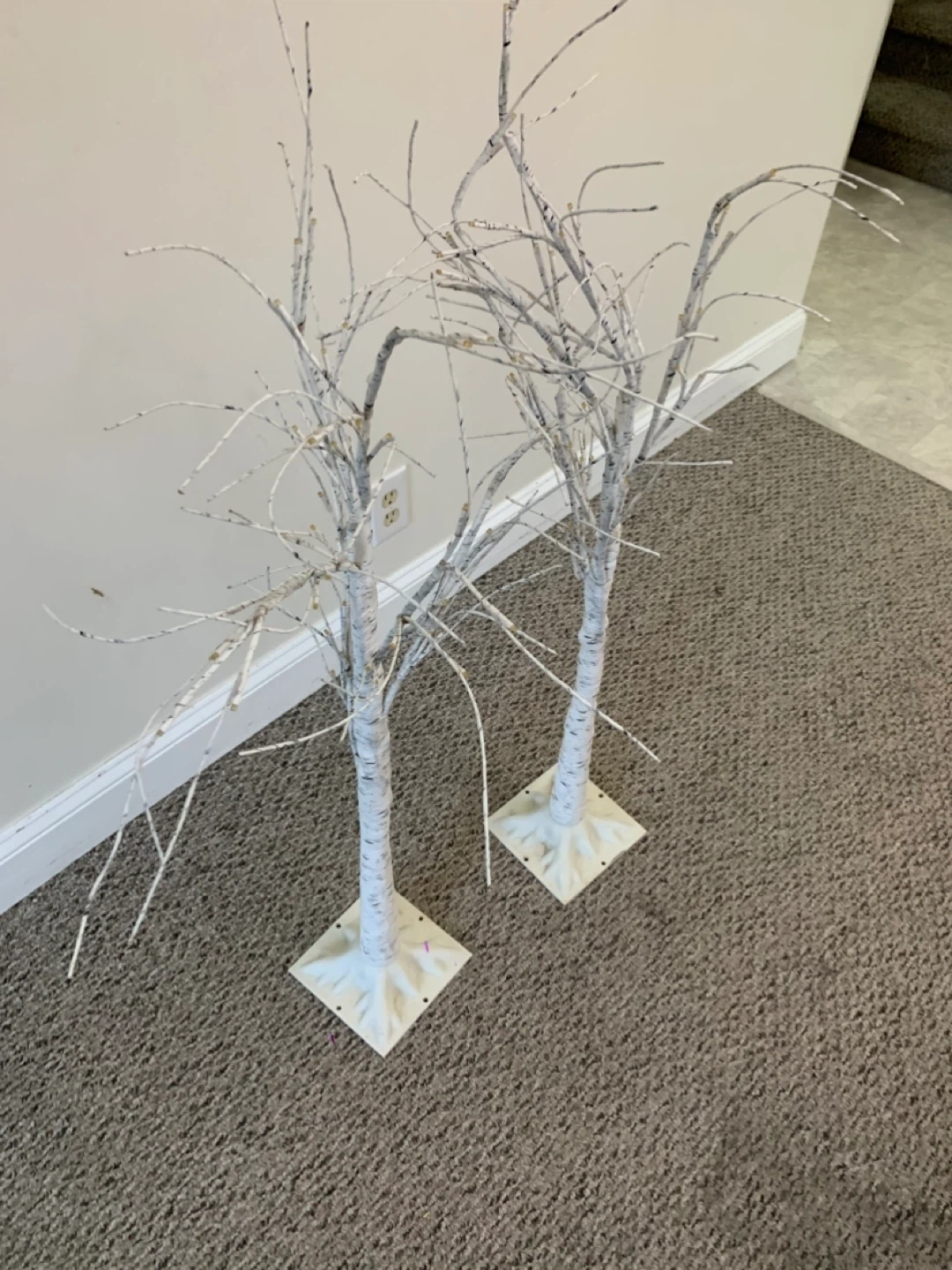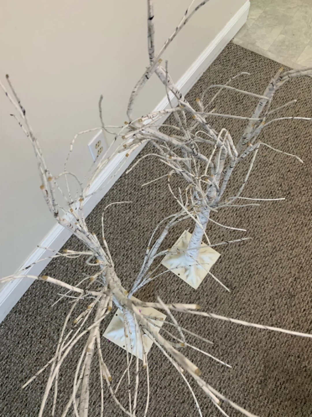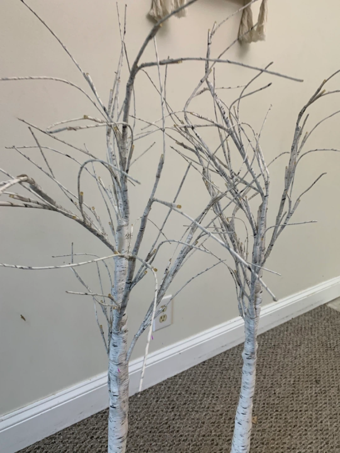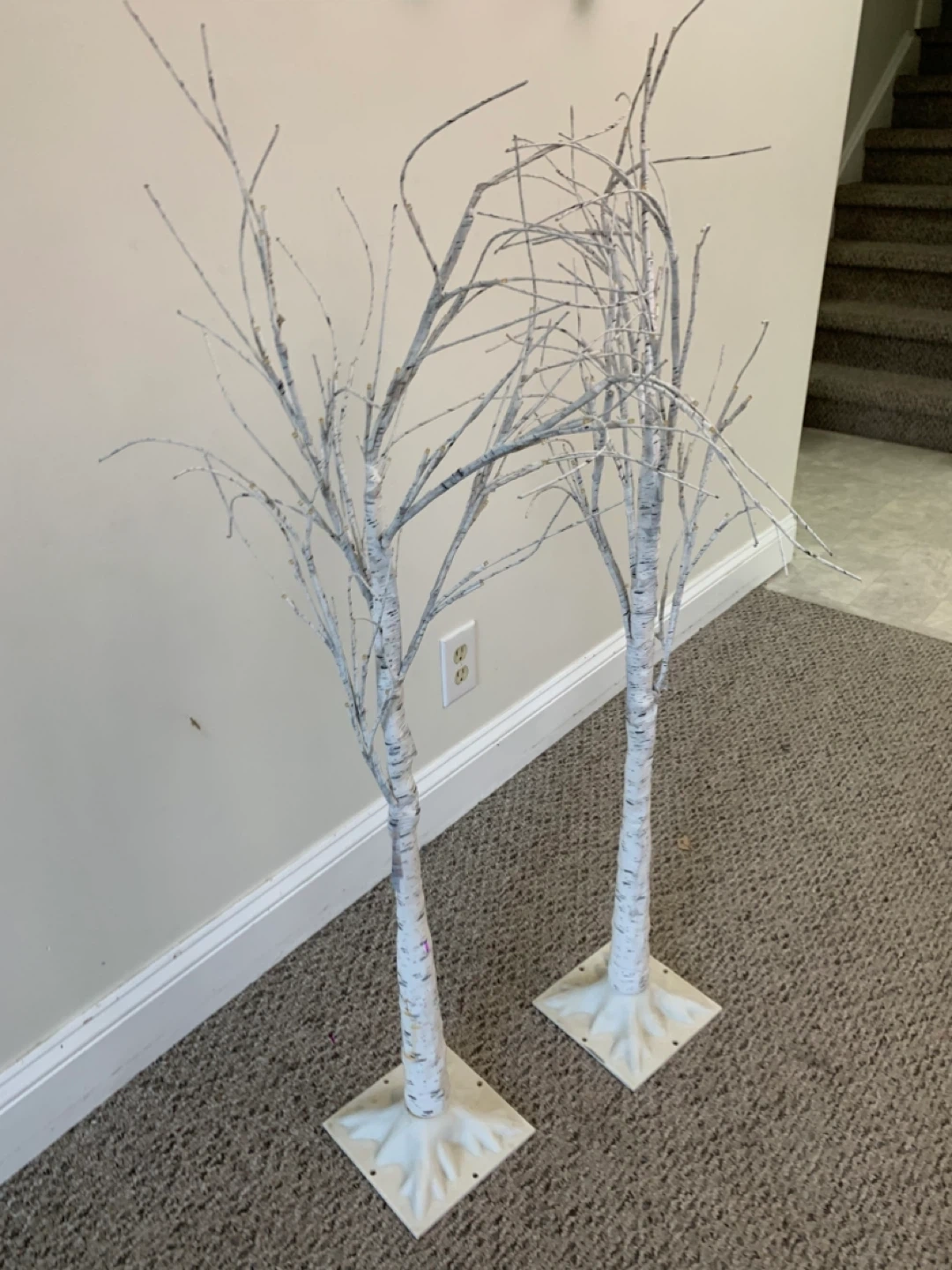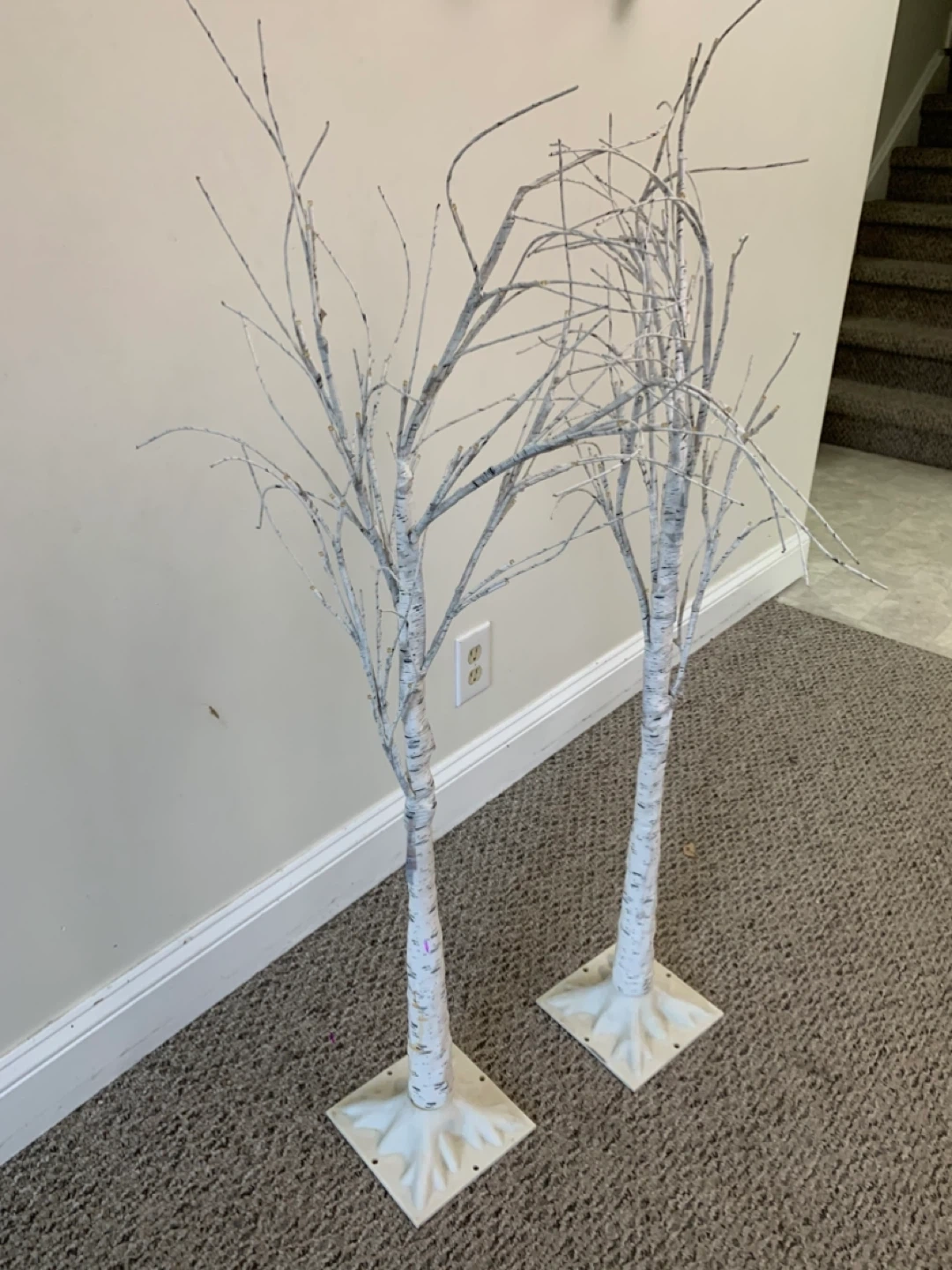 This is a set of two decorative white birch trees. They have a realistic bark texture and delicate branches, perfect for adding a wintery or natural touch to your decor. Each tree stands on a square base for stability. They're great for holiday displays or year-round accent pieces!