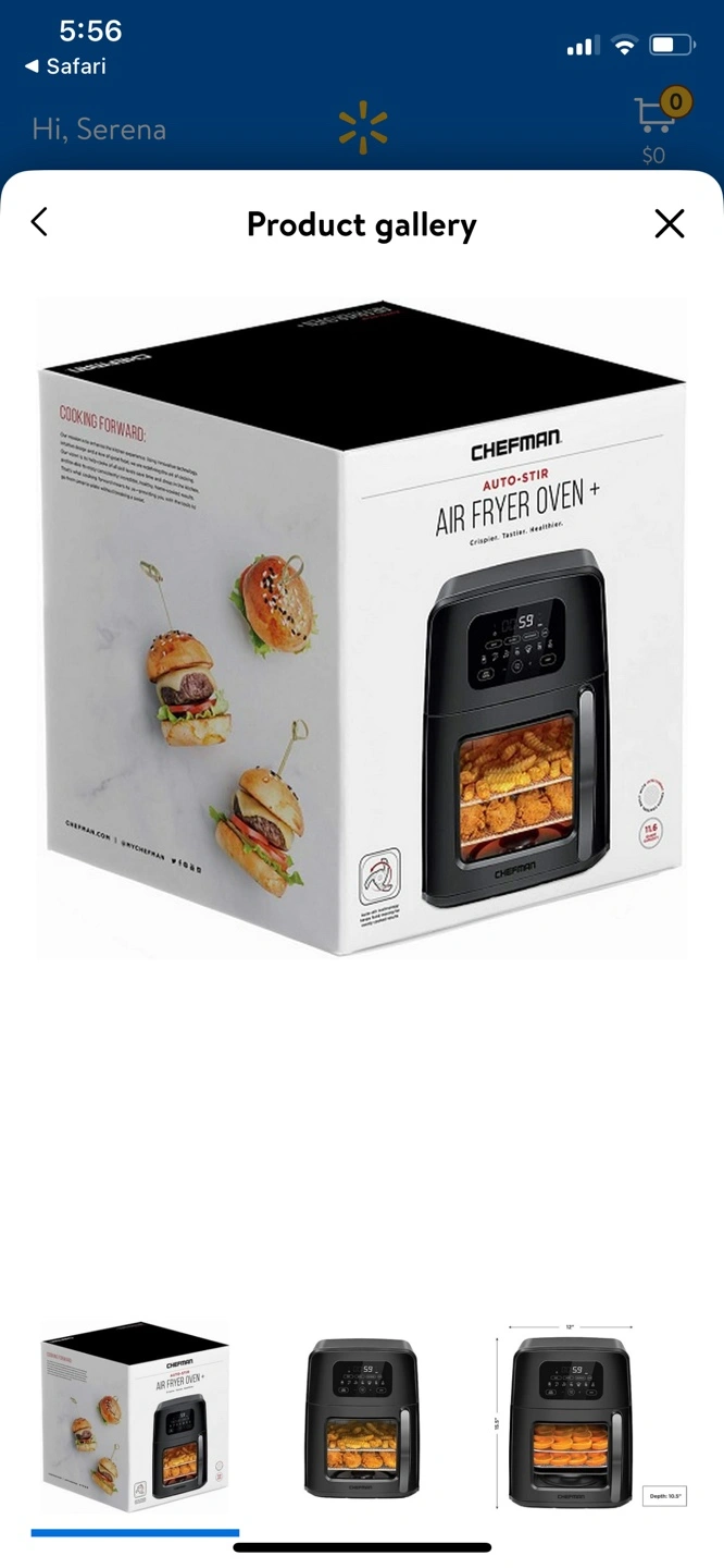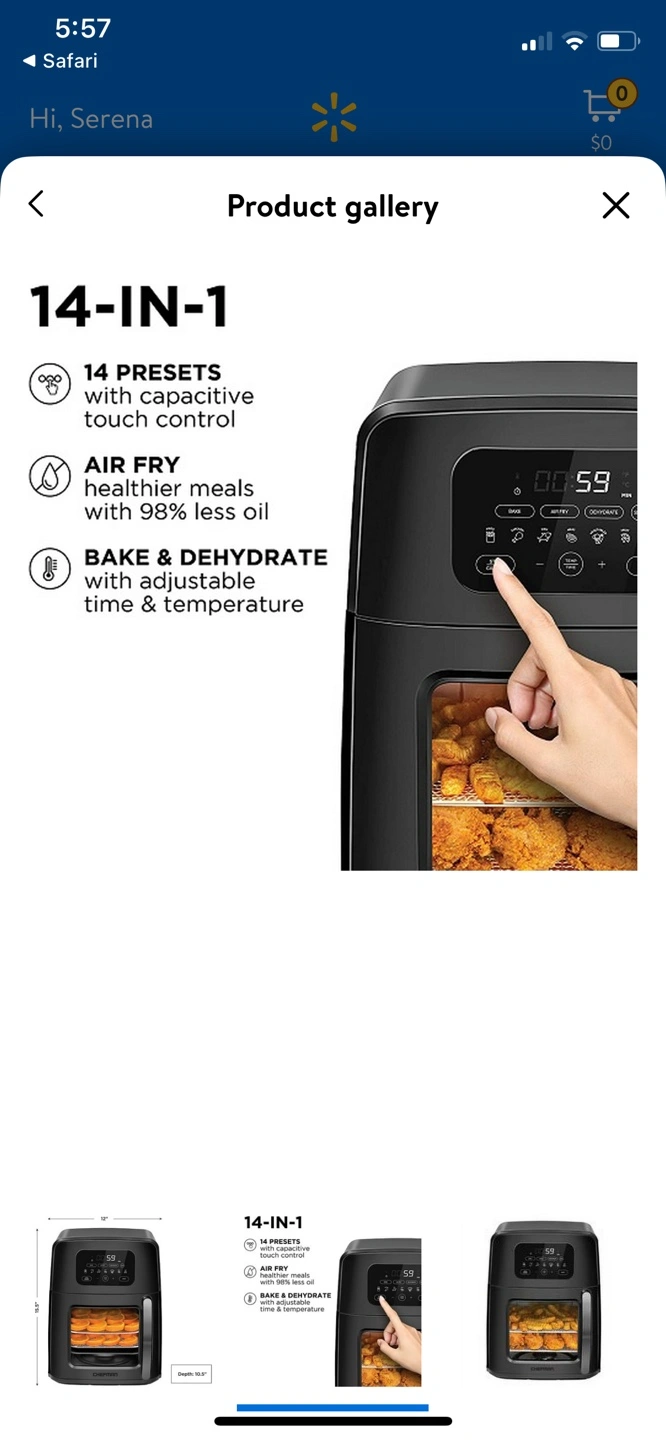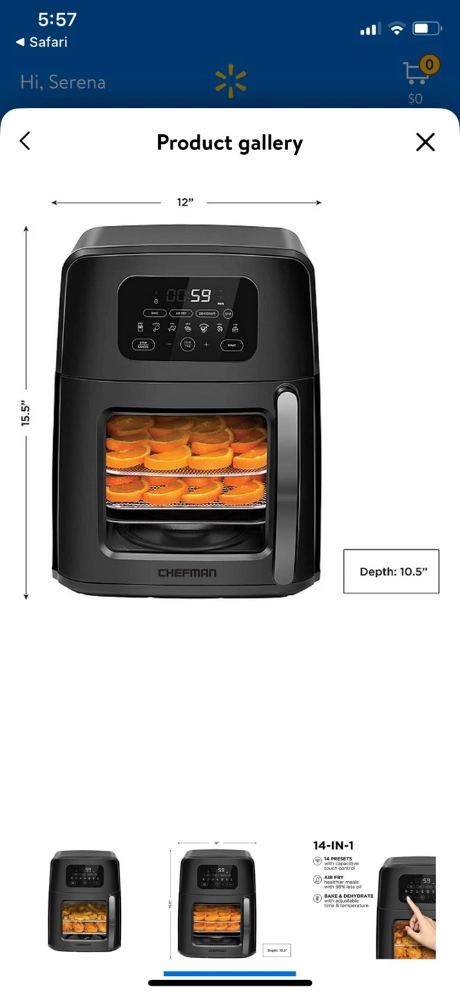 14-in-1 air fryer oven. Features 14 presets, capacitive touch control, air fry, bake, and dehydrate functions. Adjustable time and temperature settings. Large capacity. Black.